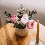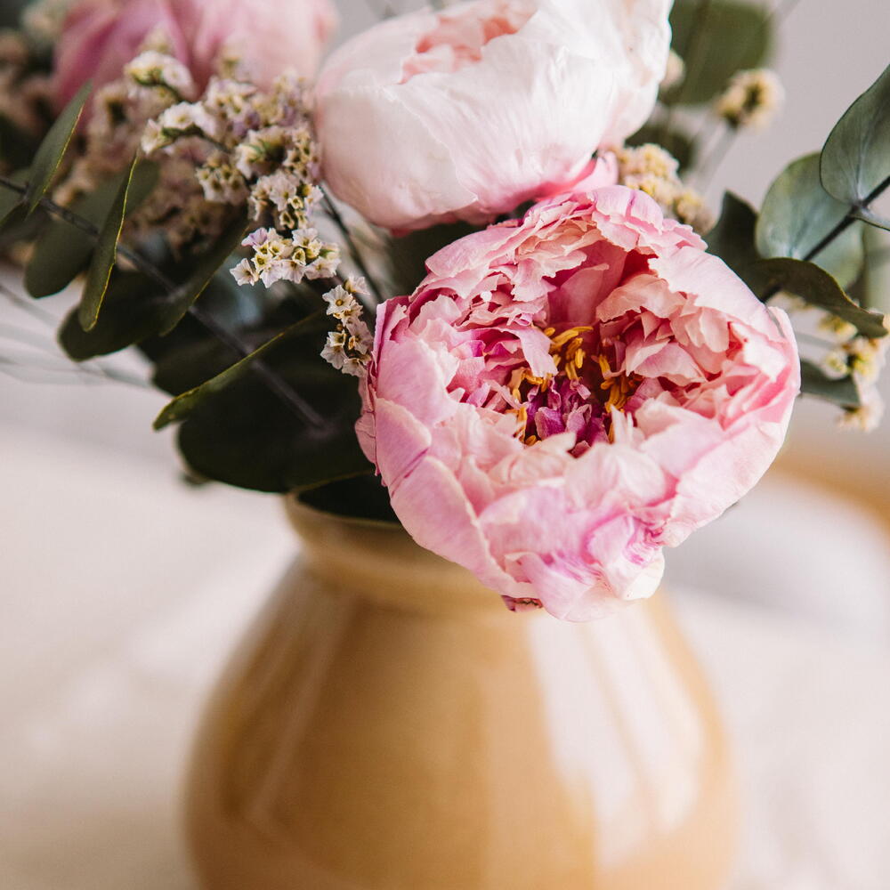limonium blanco - 5 ud. eucalipto cinerea preservado - 6 ud. peonías preservadas - 3 ud. cerámica - 1 ud.