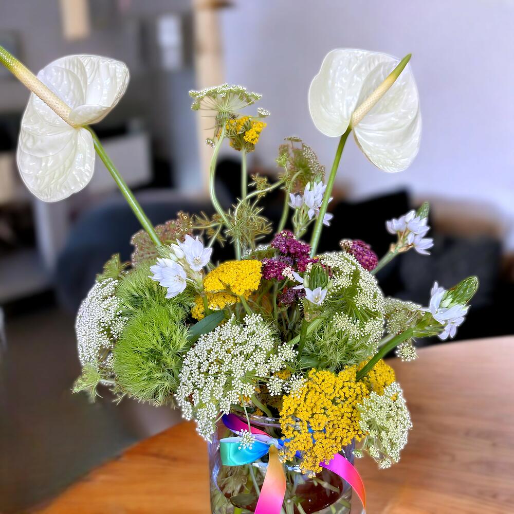 Un arreglo alegre y fresco con inspiración campestre. Perfecto para llenar de color y energía