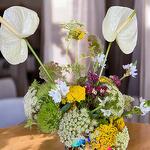 Ornithogalum - 4 ud. Viburnum - 4 ud. Anthurium - 2 ud. achillea - 4 ud. jarrón cristal - 1 ud. clavel barbatus verde - 4 ud. clavel lima - 3 ud.