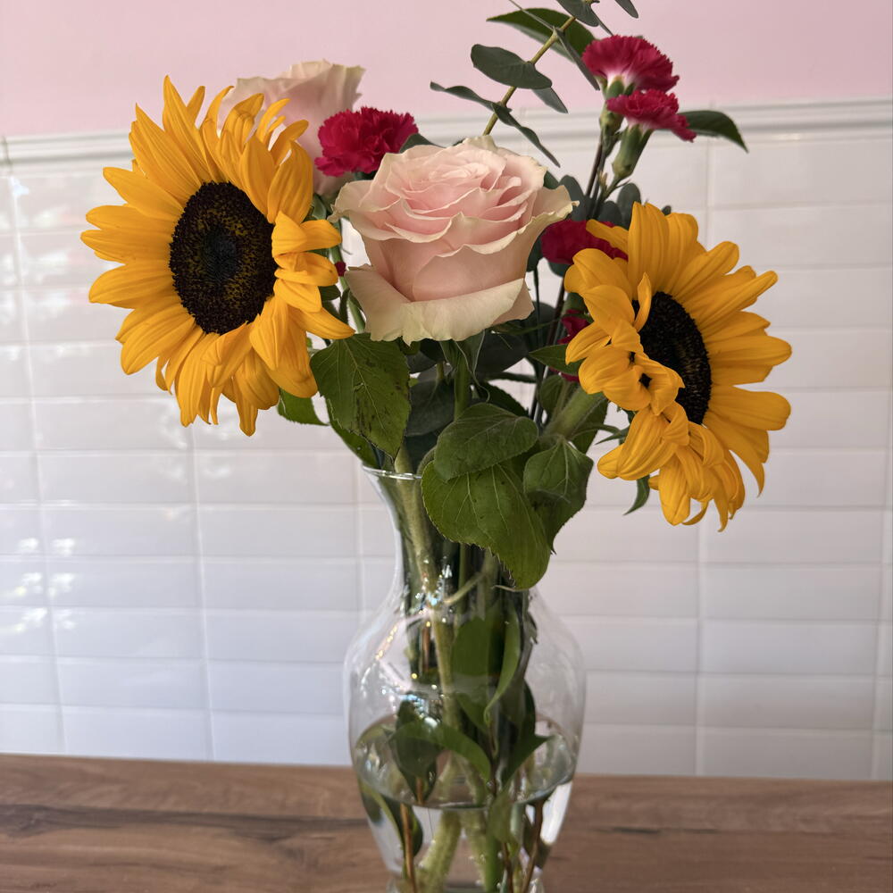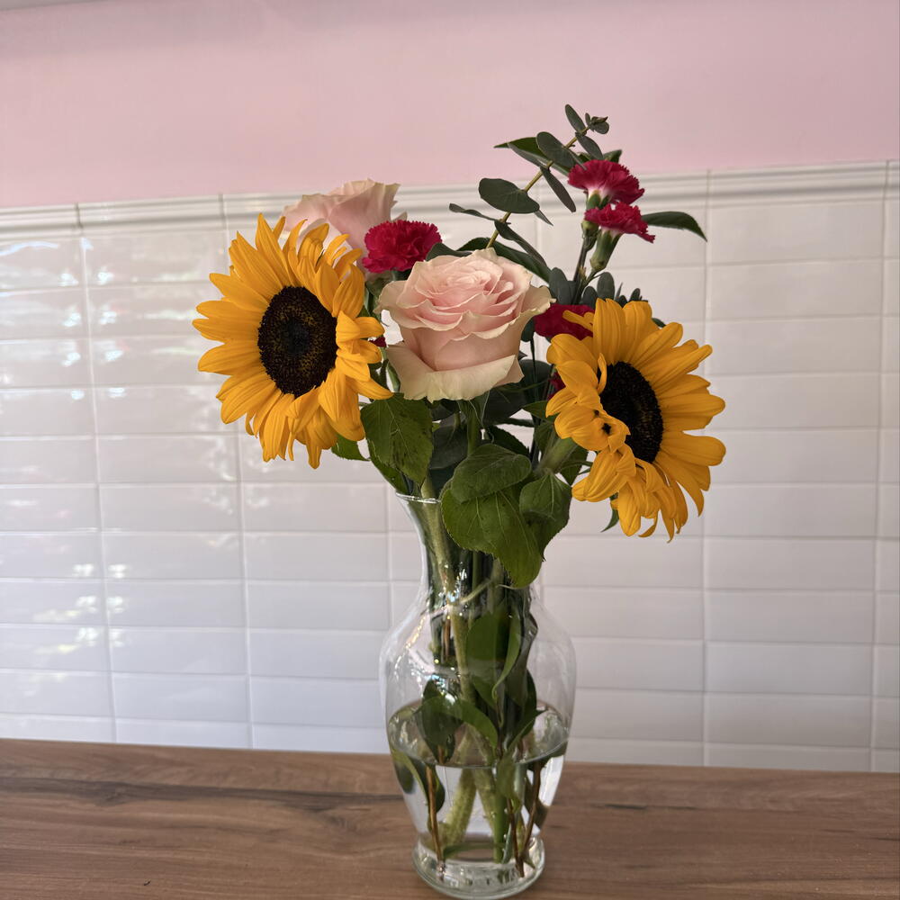 eucalipto - 2 ud. rosas - 2 ud. girasoles - 2 ud. jarrón de cristal - 1 ud. clavelinas - 2 ud.