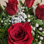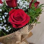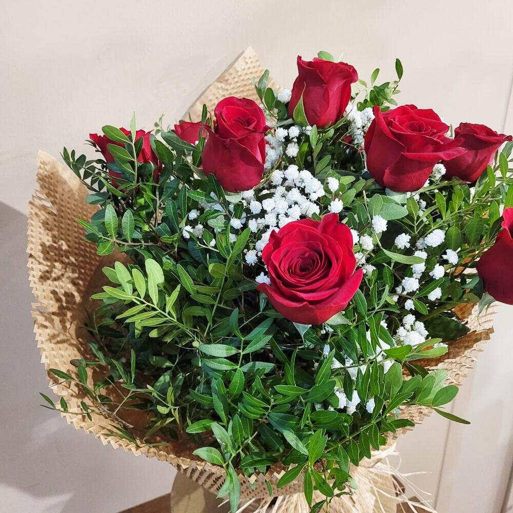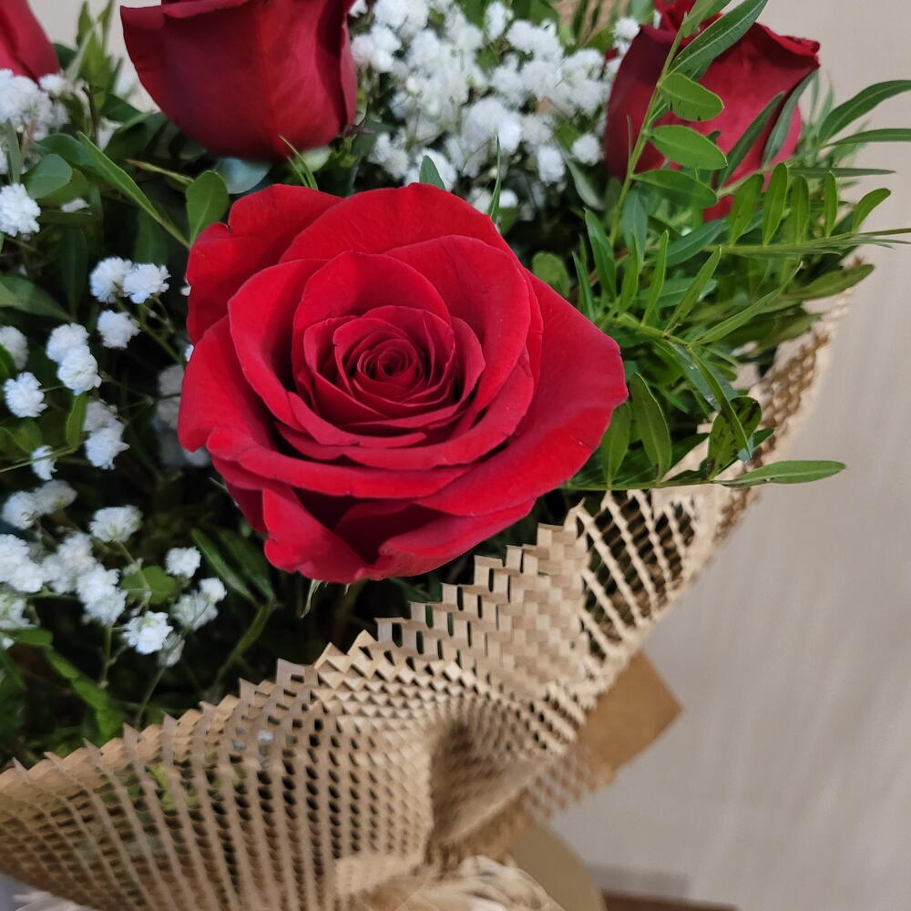 Un ramo elegante y atemporal compuesto por hermosas rosas rojas, delicadas flores blancas y un toque de follaje verde fresco. Su envoltura en papel kraft natural y el lazo de rafia aportan un estilo rústico y sofisticado que resalta la belleza natural de cada flor. Ideal para expresar amor, gratitud o simplemente para sorprender en cualquier ocasión especial. Este arreglo es un clásico que nunca pasa de moda, perfecto para transmitir tus sentimientos de una manera inolvidable. Ramo de rosas rojas envuelto en papel de Kraft de rejilla, una sensación muy natural para cualquier ocasión
