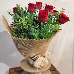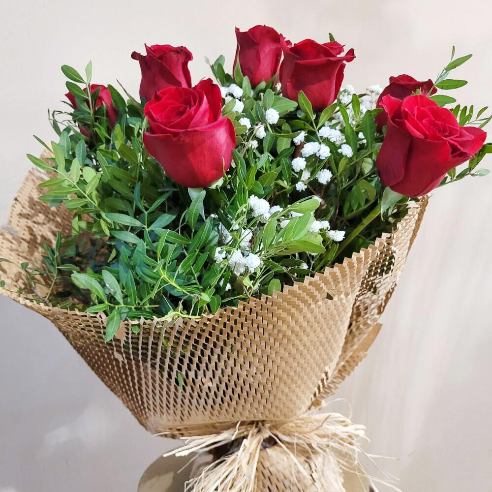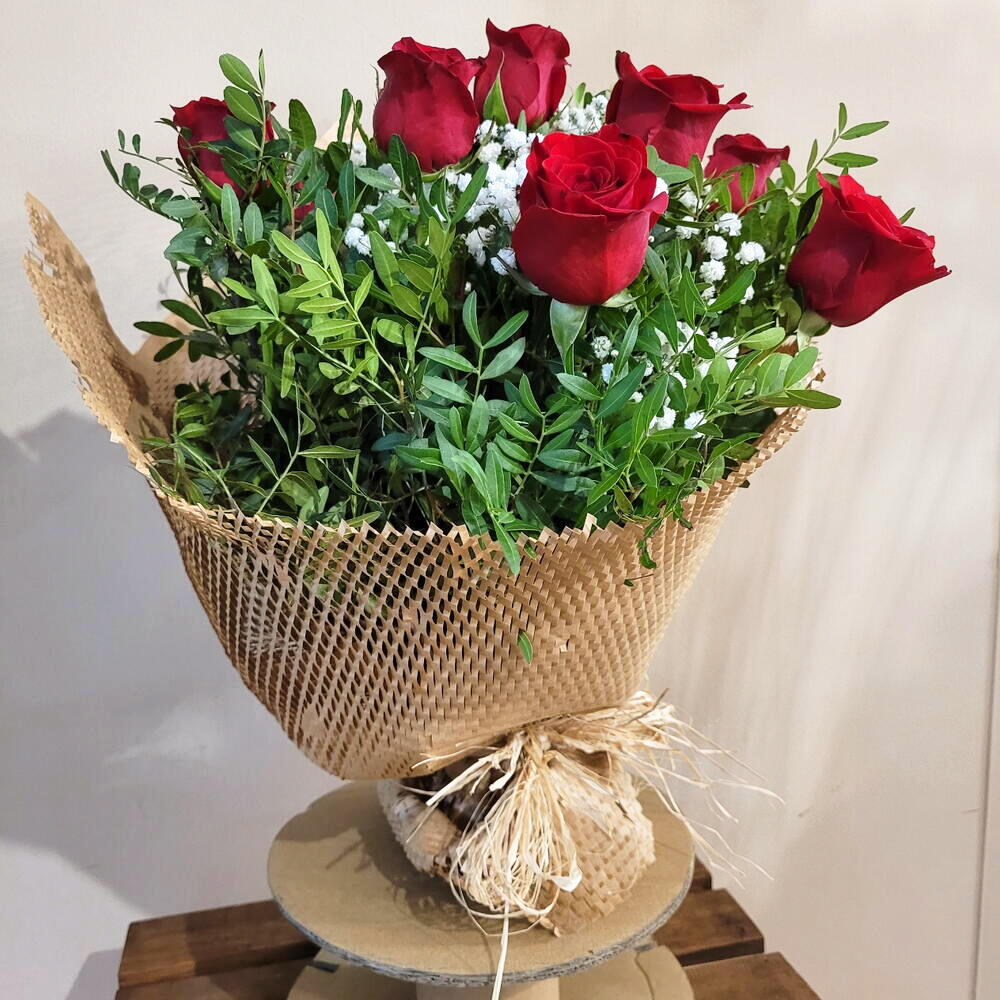 rosas rojas - 6 ud. peniculata - 5 ud. lentisco - 6 ud. papel de kraft rejilla - 1 ud. lazo rafia - 1 ud.