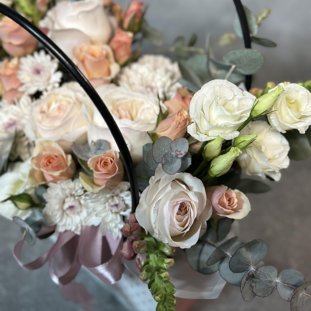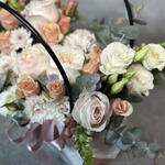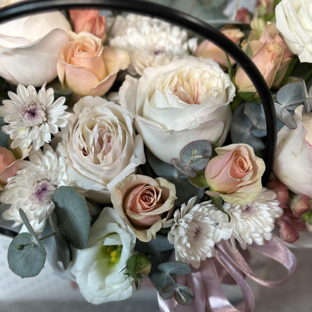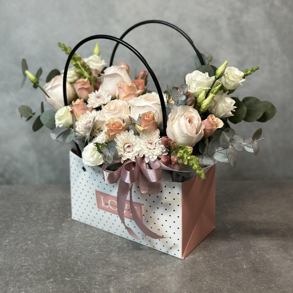 Lisianthus - 2 ud. antirrinum - 3 ud. cinta - 1 ud. embalaje - 1 ud. rosas de jardín - 5 ud. rosas ramificadas - 3 ud. eucalipto cinerea - 4 ud. margarita - 2 ud. esponja floral - 1 ud. la bolsa de papel - 1 ud.