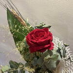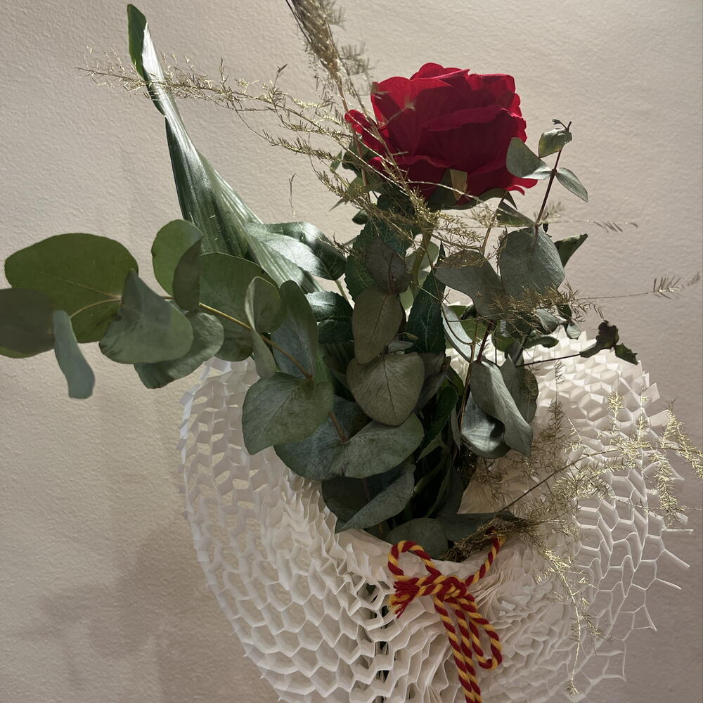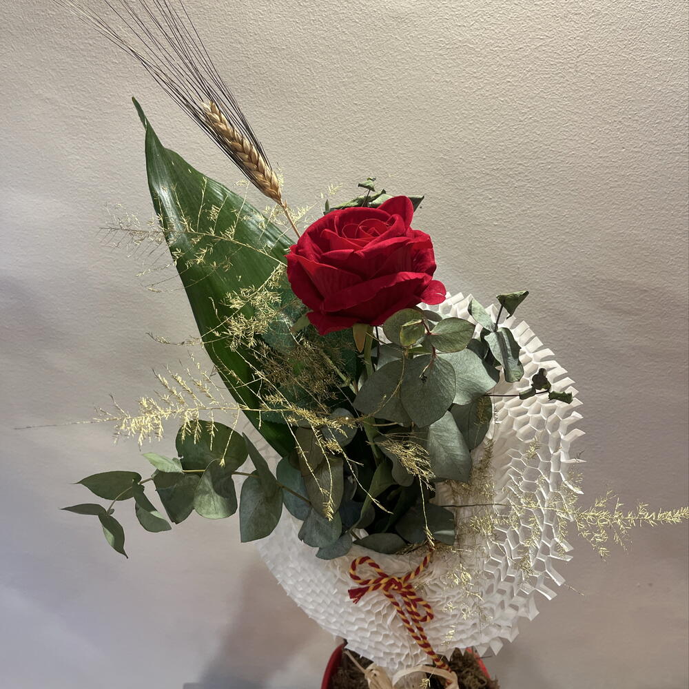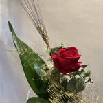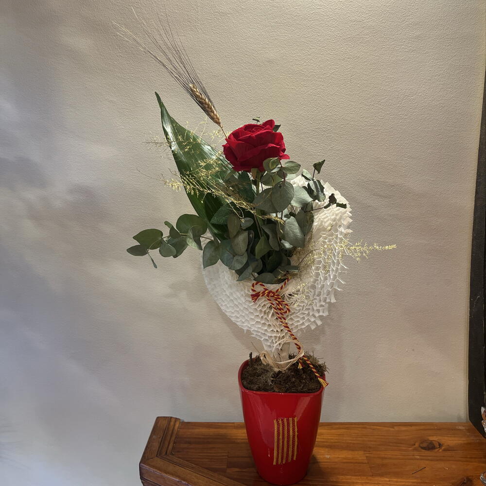 Rosa roja de Sant Jordi en composición floral con eucalipto, verdes y detalles silvestres, presentada en envoltorio texturizado y acabado artesanal. Un diseño más elaborado, elegante y con personalidad.