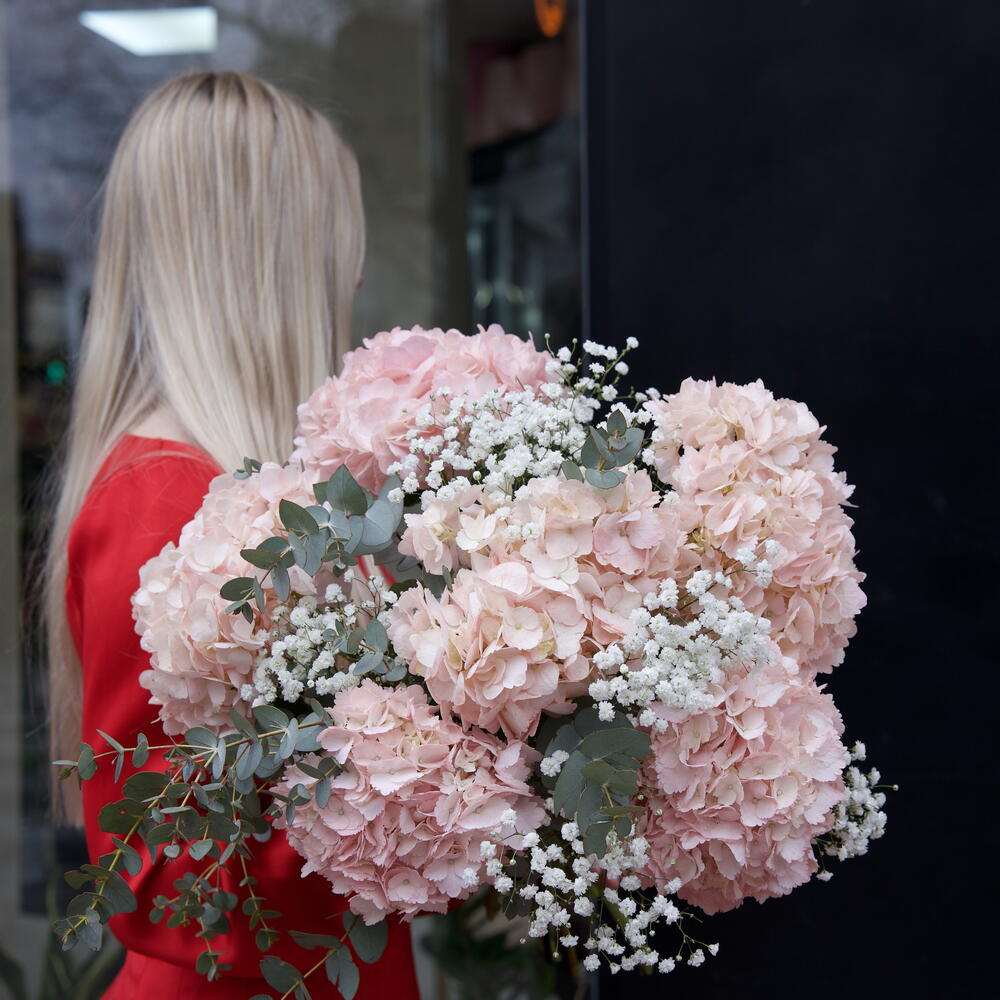 Este elegante ramo clásico se compone de delicadas hortensias (6 unidades), frescos eucaliptos (2 unidades) y sutiles paniculatas (2 unidades). Las flores están armoniosamente mezcladas, creando una agradable combinación visual y una atmósfera de frescura natural. Perfecto para alegrar cualquier espacio o para regalar en cualquier ocasión.