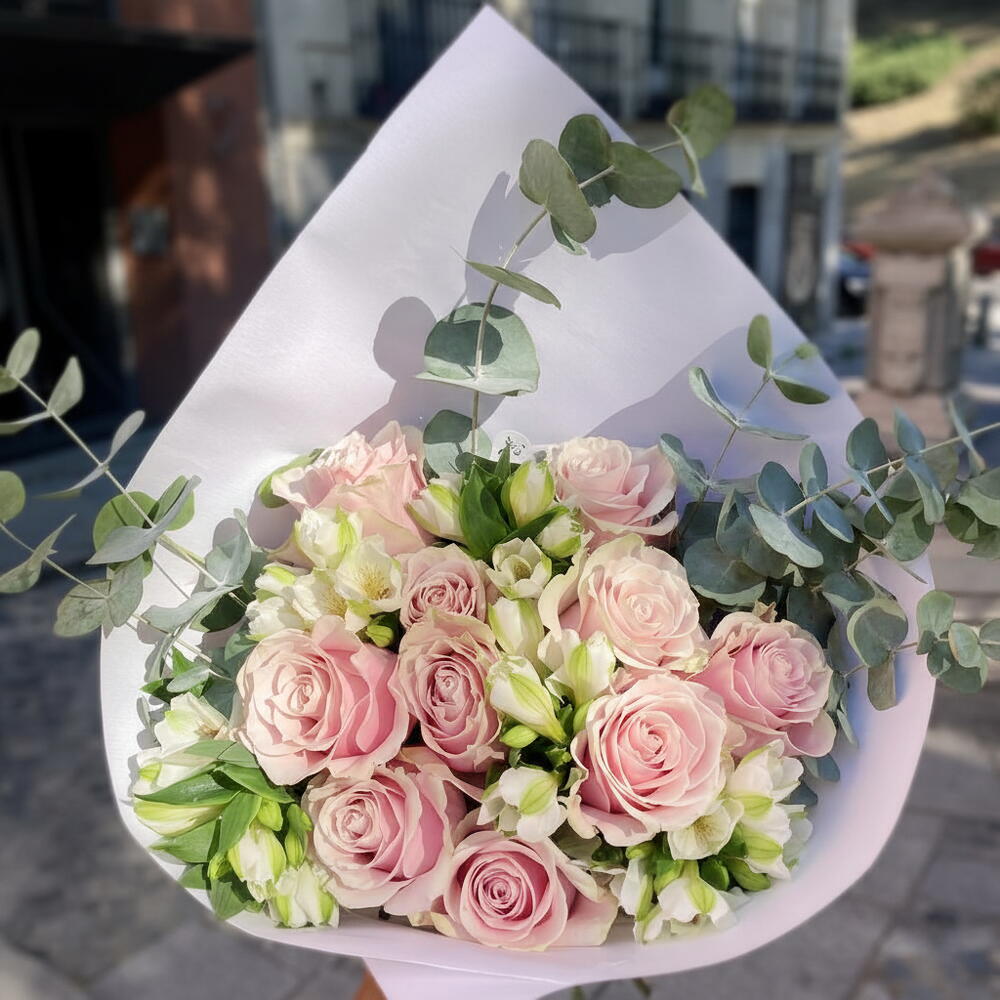 11 preciosas rosas color rosa acompañadas con astromelias blancas y eucalipto. Perfume de flores y bosque con un diseño clásico y elegante.