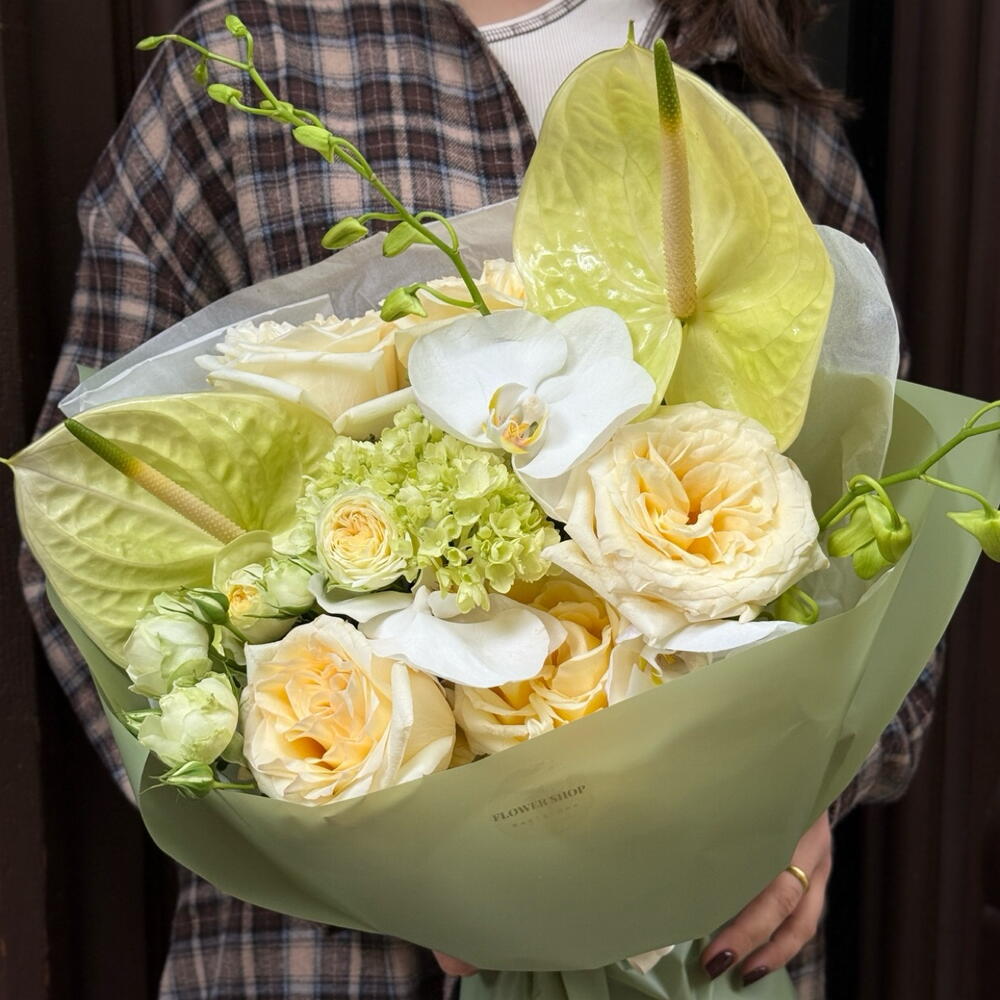 Anthurium - 2 ud. phalaenopsis orchid - 3 ud. rosa - 5 ud. rosa spray - 1 ud. dendrobium - 2 ud. hortensia mini - 1 ud.
