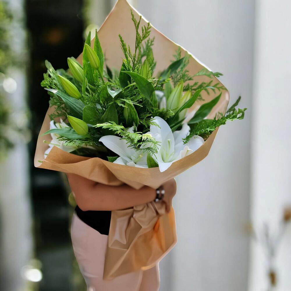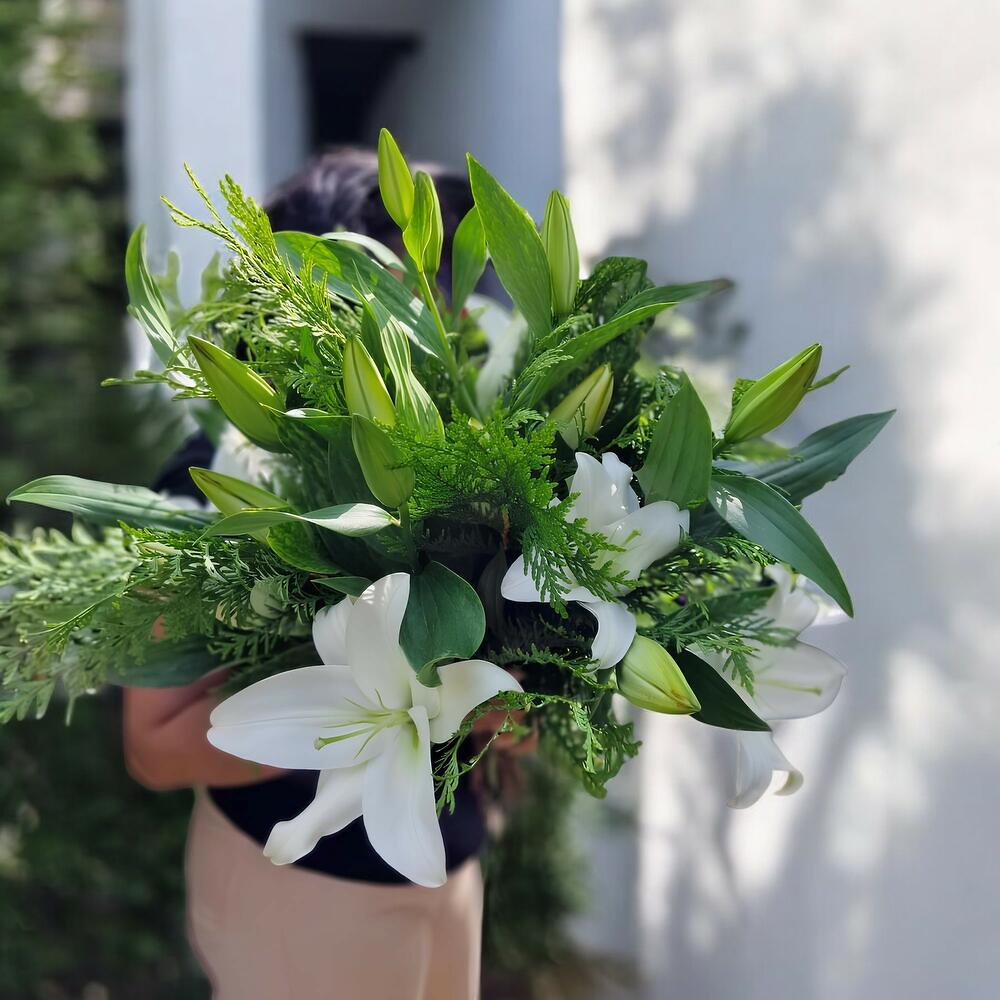 Ramo de 5 tallos Lilium oriental de color blanco, variedad de Lilium de agradable aroma y durabilidad ramo está compuesto con verdes varios como Thujas, lentiscos y eucaliptos.