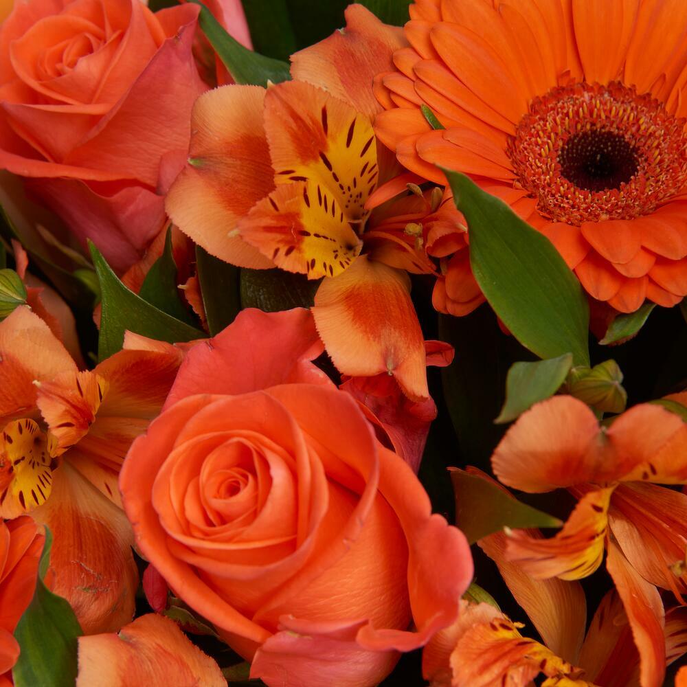 Satin ribbon - 1 ud. Greenery - 1 ud. Alstroemeria - 3 ud. gerbera mini - 3 ud. designer wrapping - 1 ud. tissue paper - 1 ud. wow rose 50 cm - 4 ud.