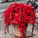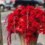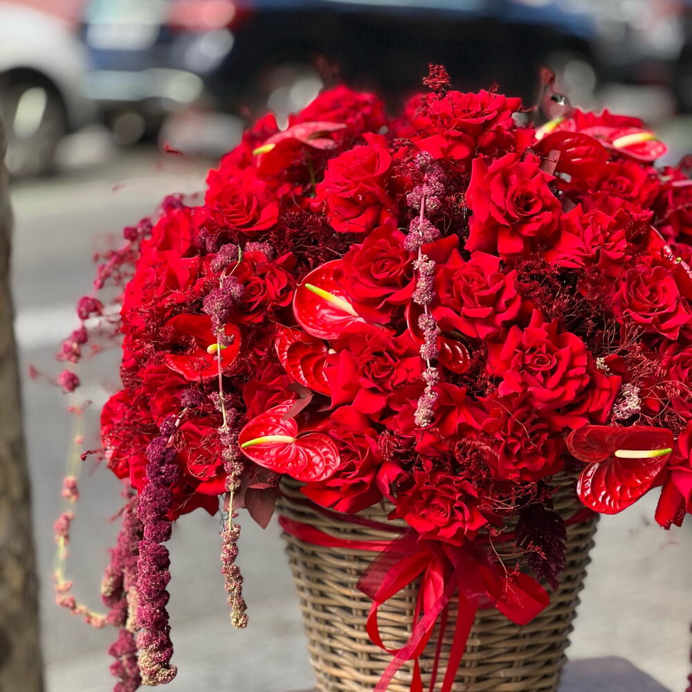 Limonium - 25 ud. Basket - 1 ud. rose - 120 ud. anturium - 15 ud. eucalipto - 20 ud.