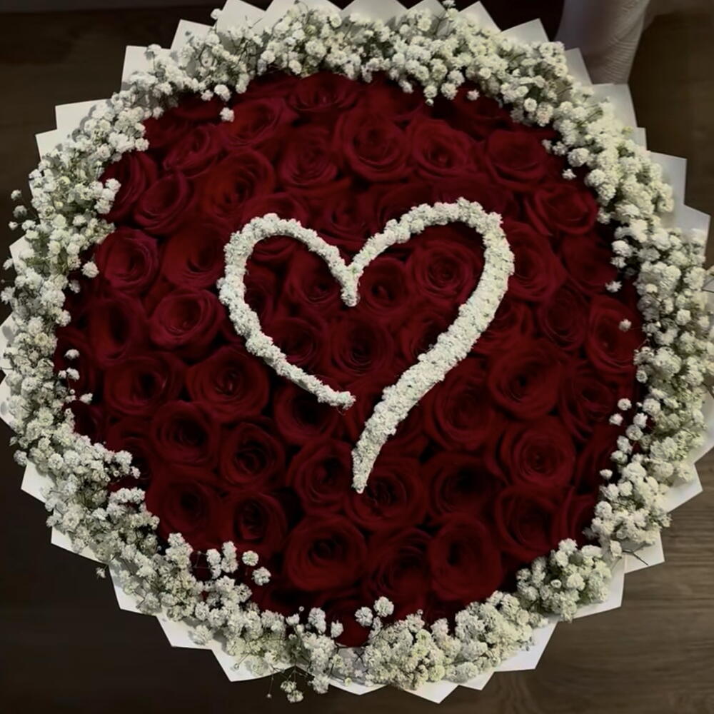 Un diseño que habla sin palabras. Este ramo presenta un corazón perfecto de rosas rojas intensas, símbolo de amor profundo y pasión verdadera, delicadamente enmarcado por una nube de paniculata blanca que aporta luz, pureza y equilibrio. Su contraste entre rojo vibrante y blanco sutil crea una pieza sofisticada, romántica y visualmente impactante. Ideal para sorprender en aniversarios, declaraciones de amor o momentos que merecen ser inolvidables.