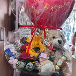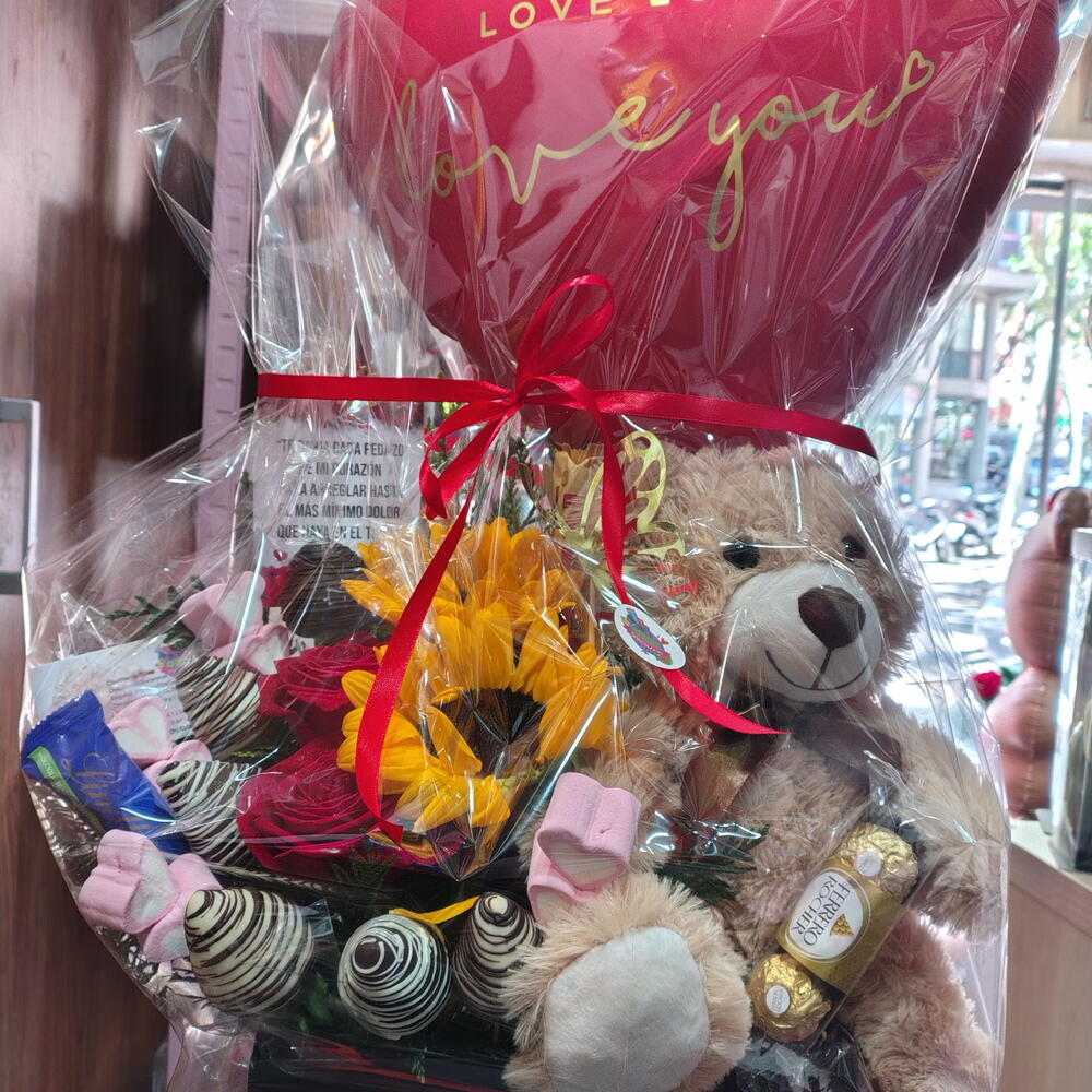 girasol - 2 ud. oso de peluche - 1 ud. Mariposa decorative - 1 ud. follaje decorativo - 1 ud. fresa con chocolate - 6 ud. tarjeta personalizada - 1 ud. ferrero rocher pack (3 piece) - 1 ud. rosa roja natural - 3 ud. trio de corazón de malvavisco - 4 ud. caja base negra - 1 ud. listón rojo - 1 ud. chocolate lindt pequeño - 1 ud. chocolate toblerone pequeño - 1 ud. globo love love 18" (color puede variar) - 1 ud.