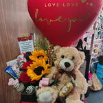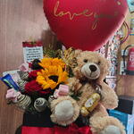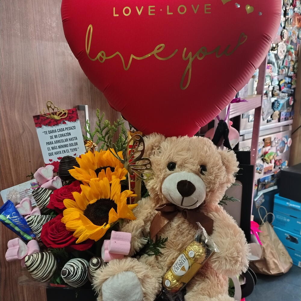 Hermosa Caja llena de mucho amor para regalar a tu persona favorita. Compuesta por rosas y girasoles, oso de peluche, Fresas con Chocolate, Bombones de chocolate, malvaviscos en forma de corazón y un globo de 18". Hecho para sorprender a ese alguien especial.