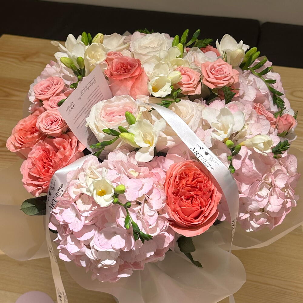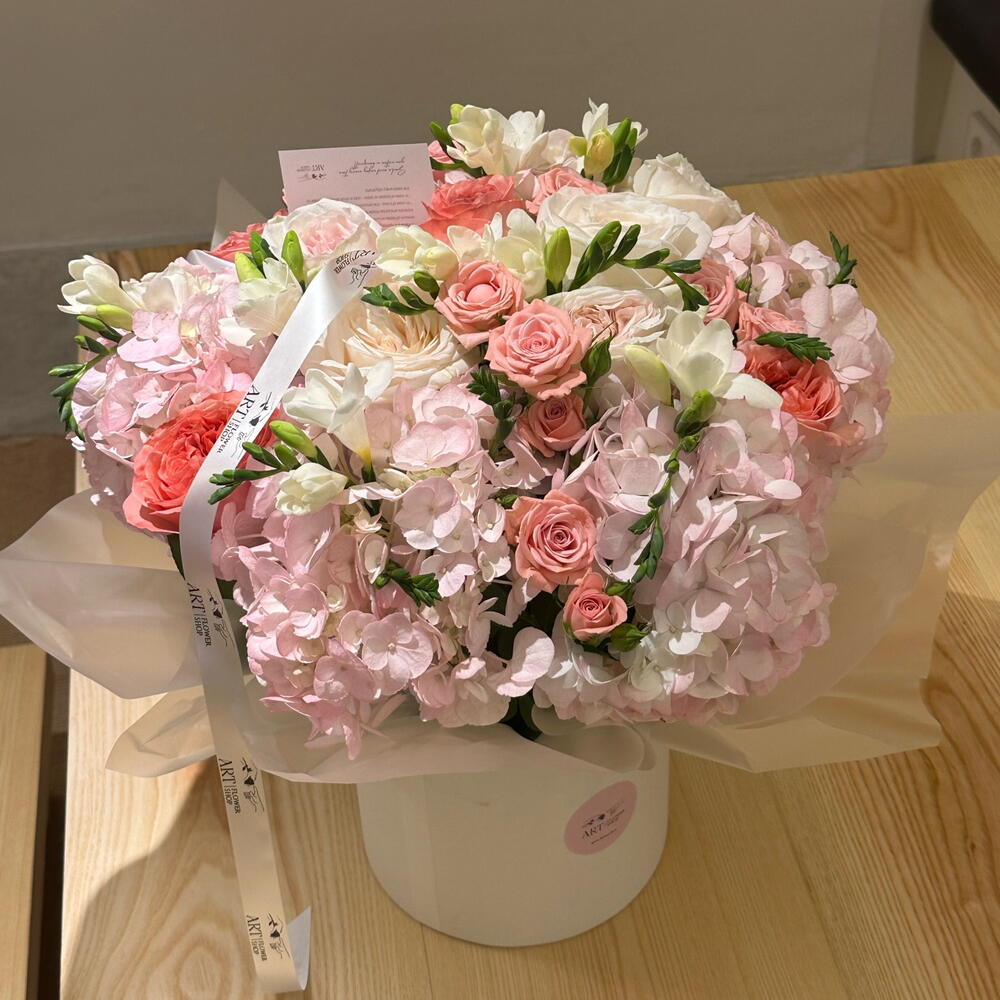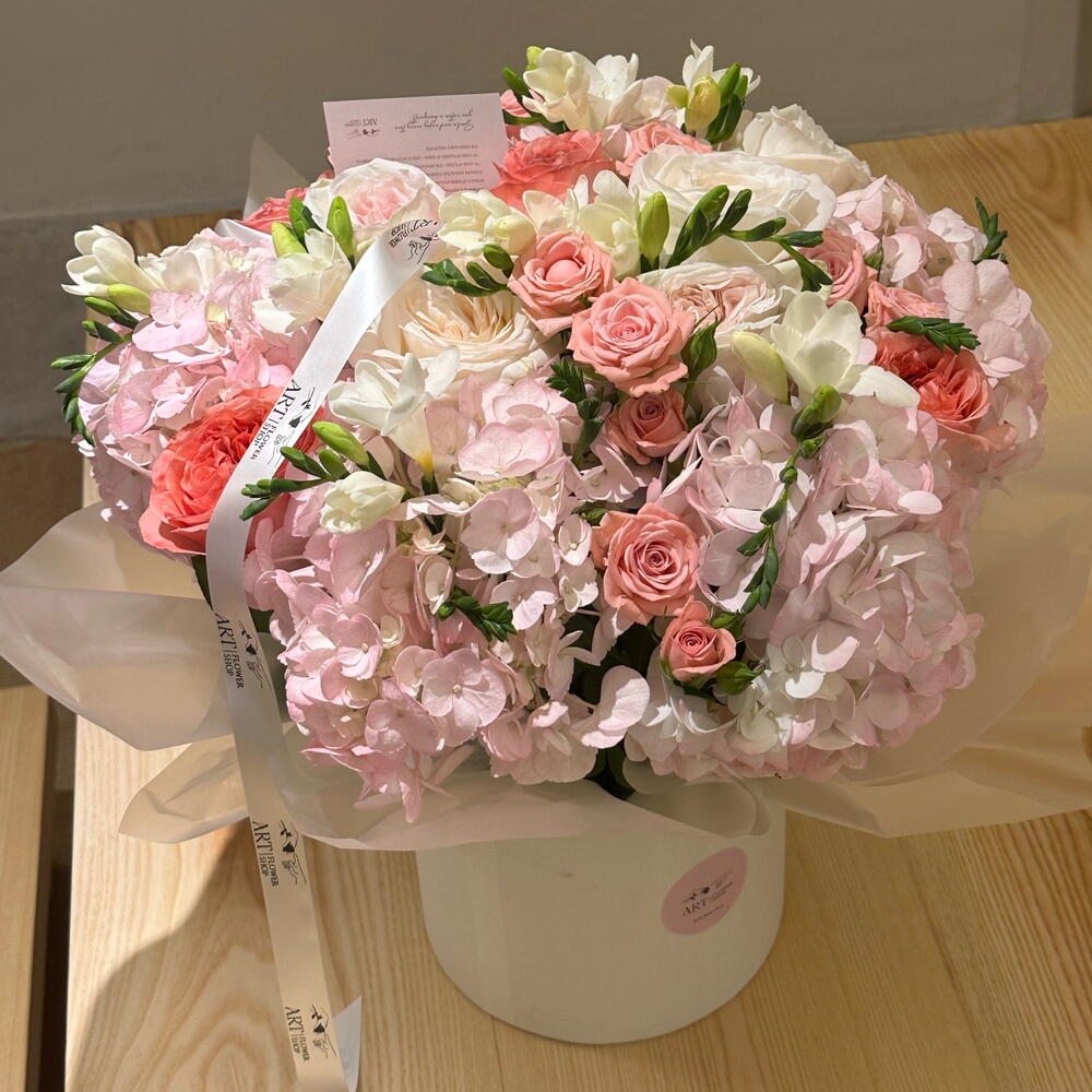 La cinta - 1 ud. Box - 1 ud. rose - 11 ud. fresia - 10 ud. flores diferentes - 3 ud. hortencia - 5 ud.