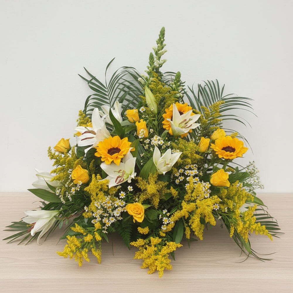 Este radiante arreglo floral es un estallido de alegría y frescura, perfecto para iluminar cualquier espacio. Los girasoles se convierten en protagonistas con su energía solar, acompañados de lirios blancos que aportan elegancia y pureza. Las rosas amarillas transmiten ternura y optimismo, mientras que las margaritas y el solidago refuerzan la vitalidad del conjunto. El follaje verde equilibra la composición, creando un contraste armónico y lleno de vida. Es un detalle ideal para celebraciones, cumpleaños o como un gesto de gratitud y buenos deseos. Cada flor ha sido cuidadosamente seleccionada para transmitir calidez, esperanza y felicidad.