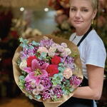 Un ramo exquisito creado en una paleta delicada y vibrante: los tonos rosados y cremosos se combinan con acentos rojo intenso. El lirio real, las elegantes rosas, la ligera paniculata y la frescura del eucalipto hacen que la composición sea armoniosa y refinada. Algunas flores pueden ser de temporada y sustituirse por otras similares en color y estilo, lo que no afectará a la armonía de la composición ni a su aspecto general.