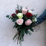 Ruskus - 3 ud. eucalipto - 5 ud. rosas rojas - 4 ud. rosas blancas - 4 ud. wax flower rosa - 3 ud. rosas rosas claras - 4 ud.