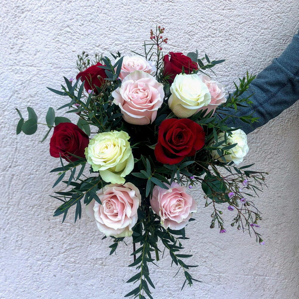 Este ramo clásico está diseñado con una combinación armoniosa de rosas en tonos rojos, rosados claros y blancos, dando una presentación llena de romanticismo y elegancia. Con un total de 5 rosas rojas, 4 rosas rosas claras y 3 rosas blancas, este conjunto floral no deja de ser llamativo y delicado. Además, se complementa perfectamente con 3 wax flowers en tono rosa que suman un toque de dulzura y originalidad a la composición. El toque final viene dado por un detalle de follaje verde compuesto por 5 ejemplares de eucalipto y 3 de ruskus, creando un equilibrio perfecto entre todas las tonalidades. Este ramo es el regalo perfecto para demostrar tu cariño y apreciación en cualquier ocasión.