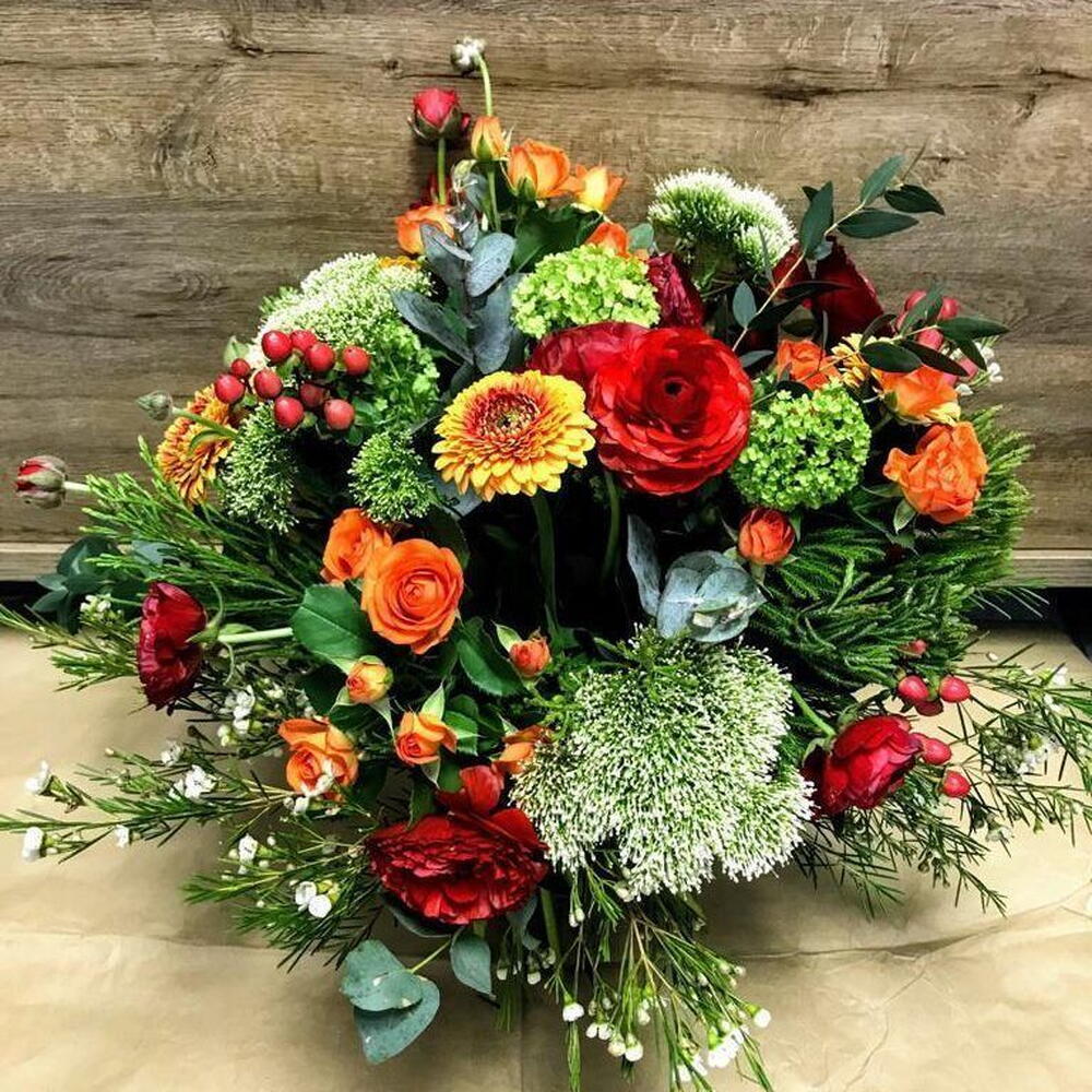 eucalipto - 2 ud. Gerbera naranja - 1 ud. rosas naranjas - 6 ud. hipericum rojo - 2 ud. claveles rojos - 5 ud. viburnum verde - 3 ud. asparagus verde decorativo - 2 ud. paniculata silvestre blanca - 2 ud.