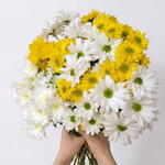 Un ramo alegre y luminoso que combina la frescura del blanco con la energía del amarillo, creando una composición llena de vida y optimismo. Las margaritas blancas y amarillas se entrelazan armoniosamente, evocando campos soleados y días llenos de felicidad. Su estilo natural y vibrante lo convierte en el regalo perfecto para transmitir alegría, gratitud y buenos deseos. Ideal para cumpleaños, celebraciones, recuperaciones o simplemente para iluminar el día de alguien especial. Este bouquet aporta calidez y frescura a cualquier espacio, llenándolo de luz y позитивной energía. Para mantener su belleza por más tiempo, se recomienda cambiar el agua cada dos días, cortar los tallos en diagonal y conservar el ramo en un lugar fresco, lejos del sol directo y corrientes de aire. Con estos cuidados, las flores conservarán su frescura y encanto durante varios días.