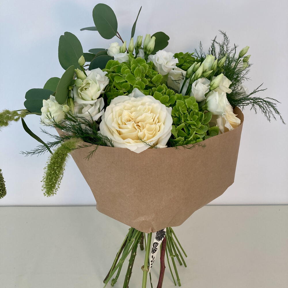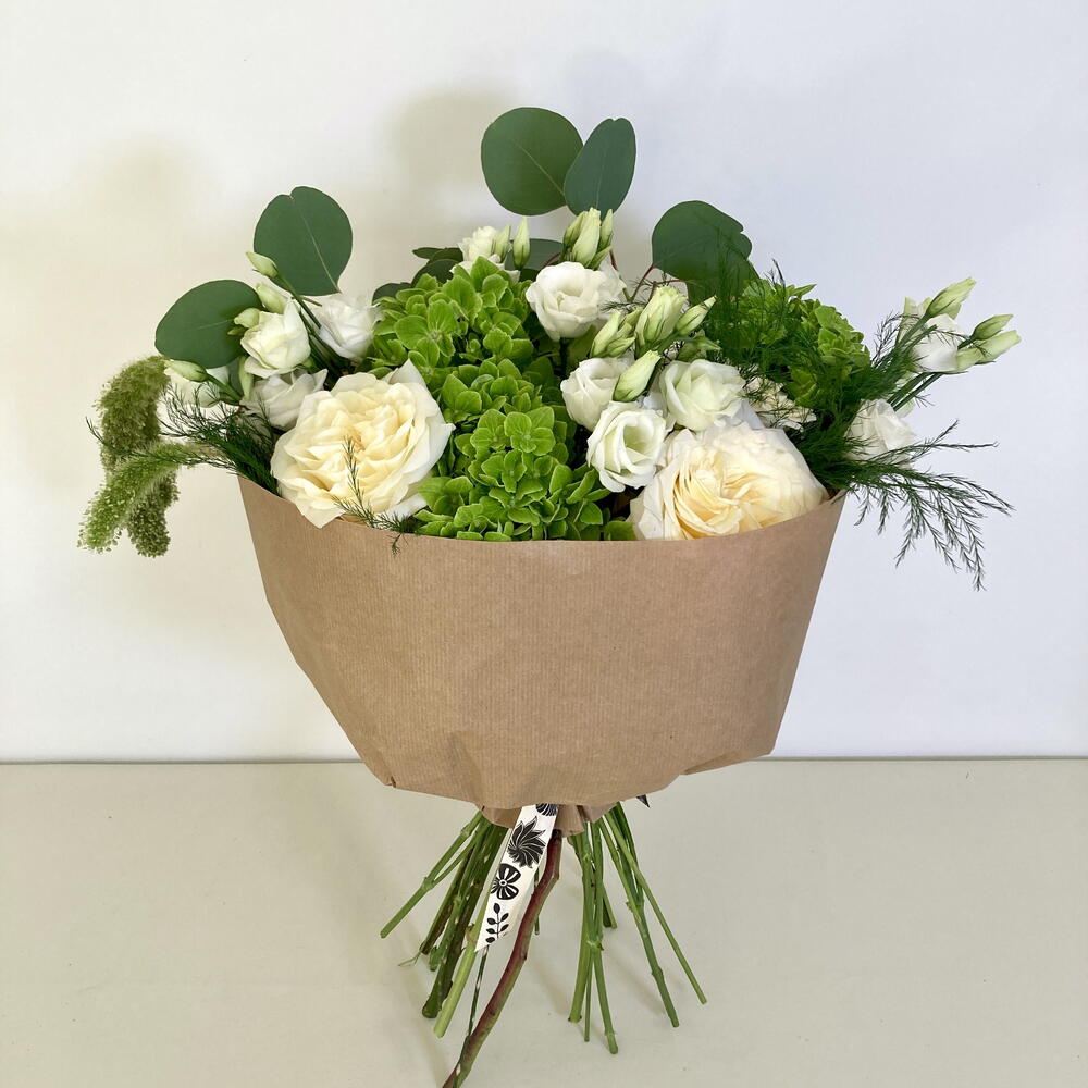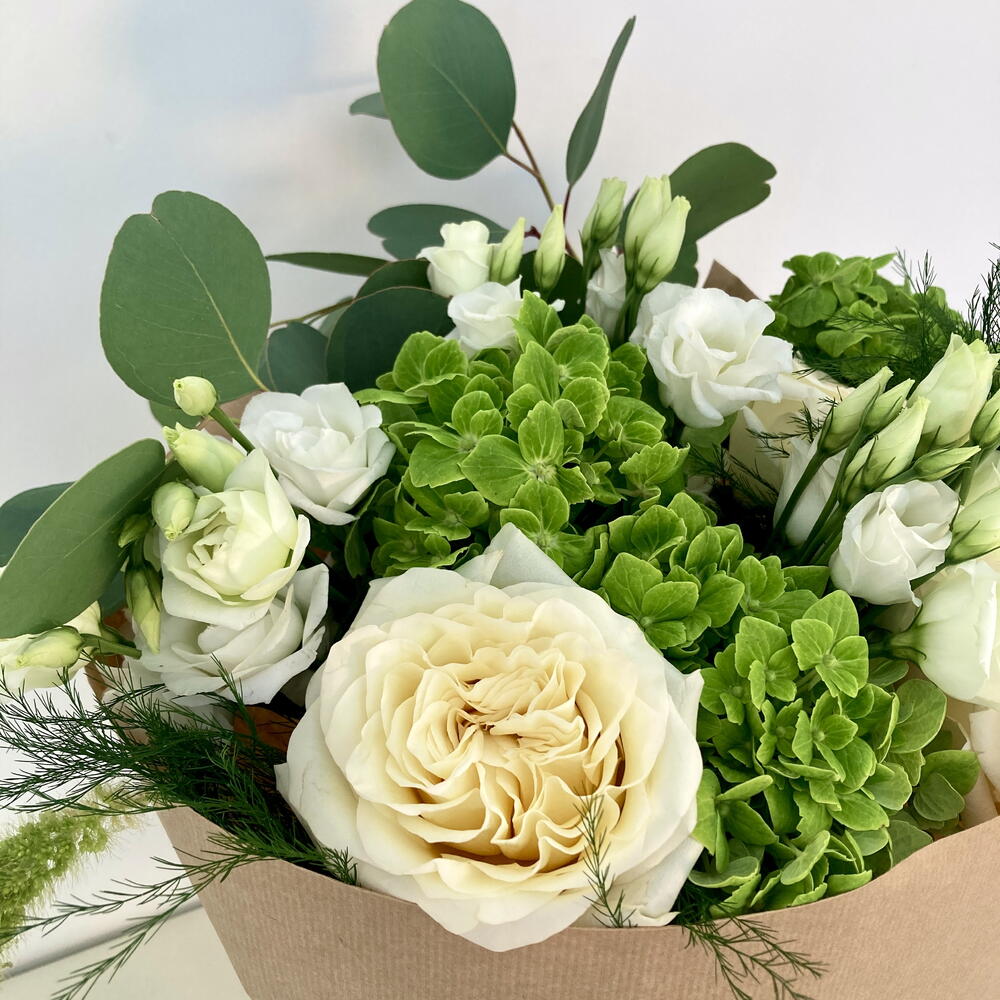 hortensia - 5 ud. rosas de jardín - 5 ud. verdes variados - 6 ud. lisanthus white - 3 ud.