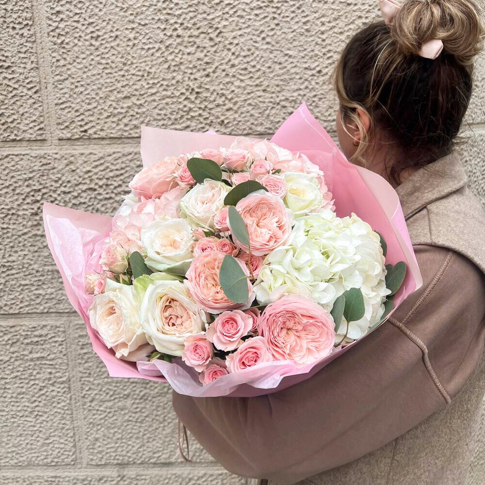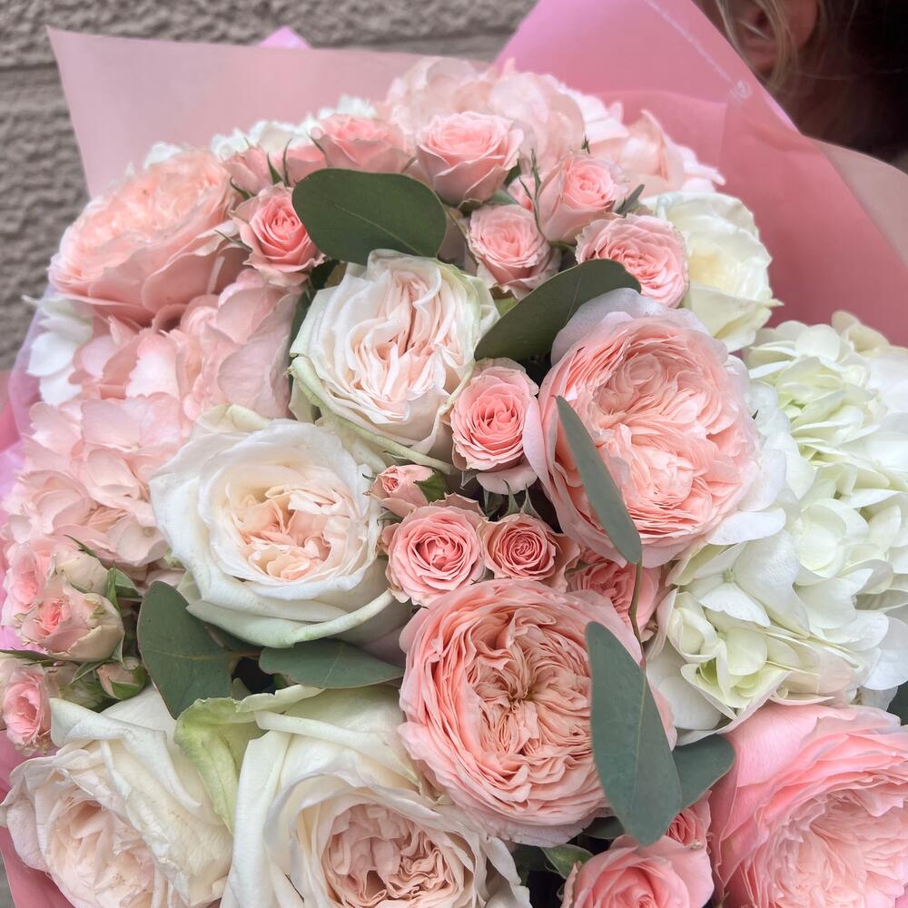 Este elegante ramo en suaves tonos rosados y blancos cautiva con su delicadeza y armonía. Las rosas aterciopeladas, combinadas con hortensias voluminosas y pequeñas rosas spray, crean una sinfonía visual que transmite ternura y amor puro. Es el regalo ideal para ocasiones especiales como cumpleaños, aniversarios o momentos donde quieras expresar tus sentimientos más sinceros. El envoltorio en tonos pastel complementa el diseño, aportando un toque romántico y sofisticado. ¡Haz que cada momento sea inolvidable con el encanto de este hermoso ramo!