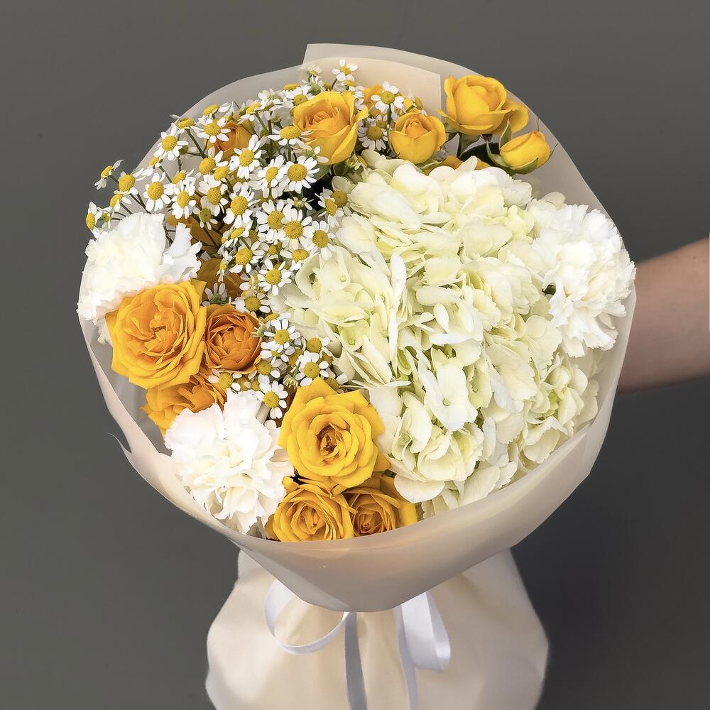 Este hermoso arreglo floral de autor se compone de una hortensia brillante, rodeada por tres unidades cada una de tanacetum, rosas en spray y claveles blancos. Cada flor fue seleccionada cuidadosamente para crear una composición vibrante y armoniosa. Este ramo aportará un toque de elegancia y frescura a cualquier ambiente.