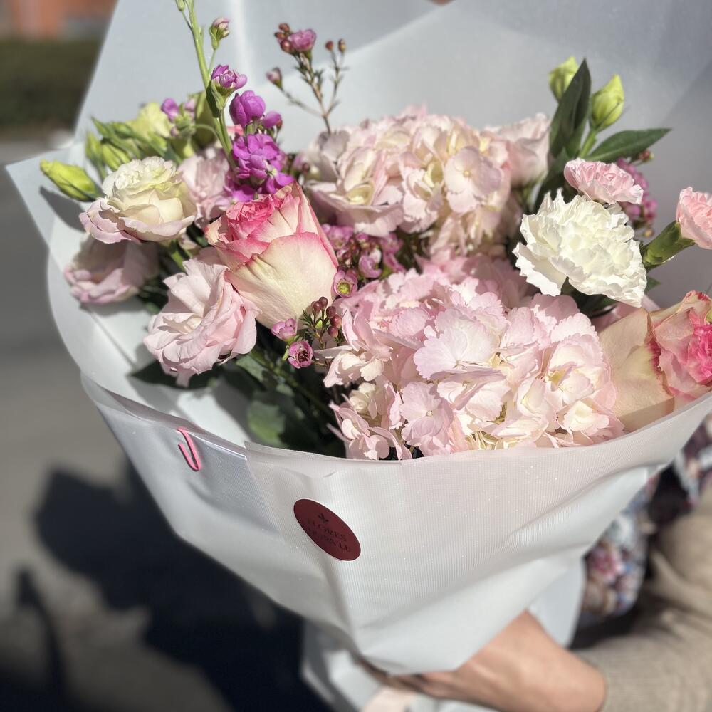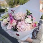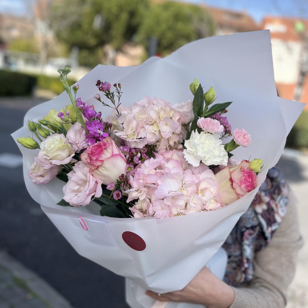 hortensia - 2 ud. clavel - 2 ud. rosas de color rosa - 3 ud. lisantium - 3 ud.