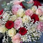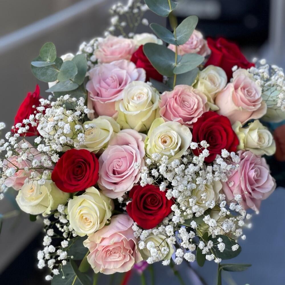 Red rose - 7 ud. White rose - 17 ud. Gypsophila - 5 ud. eucalipto cinerea - 5 ud. pink roses - 11 ud.