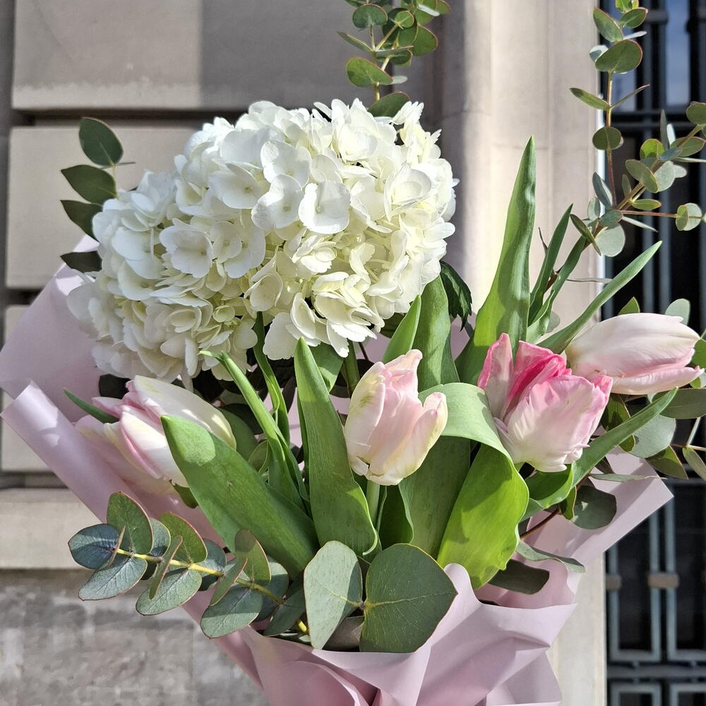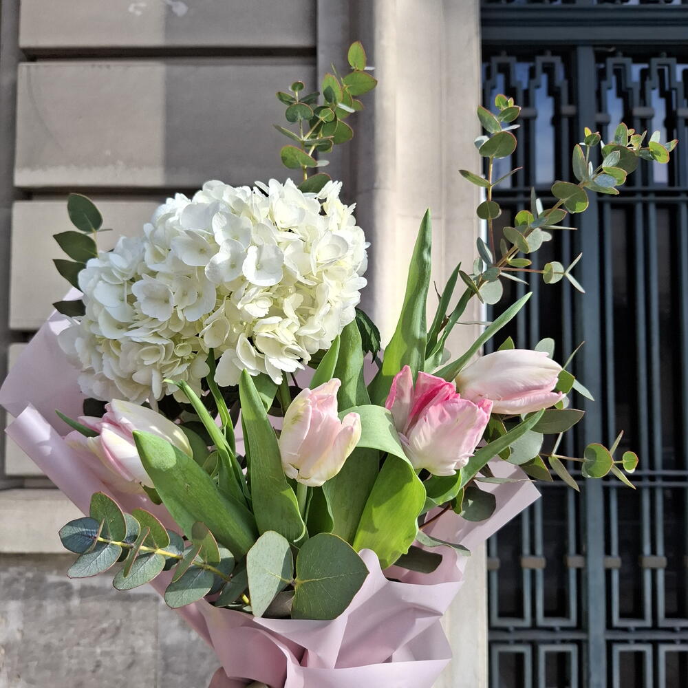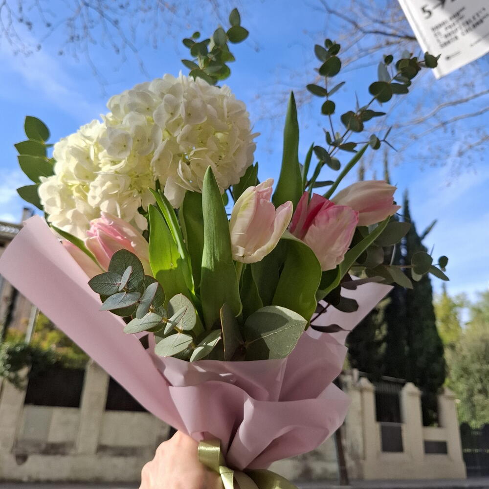 Eucalyptus - 3 ud. Tulips - 4 ud. Hydrangea - 1 ud. cinta de raso - 2 ud. papel decorativo - 2 ud.