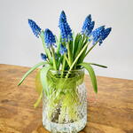 Delicado centro de Musicari Azul en jarron de cristal, frescura y tranquilidad, nuevos comienzos recibiendo la primavera