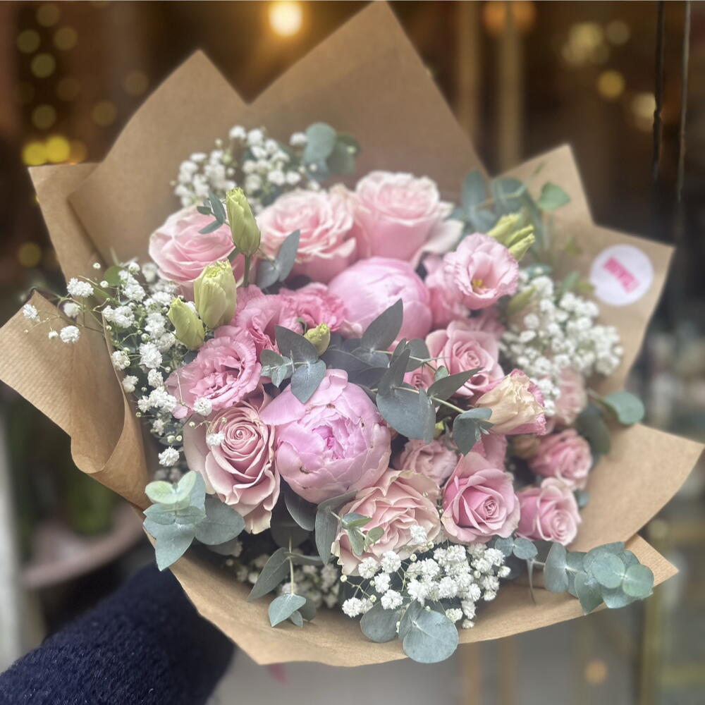 Spray rose - 1 ud. Lisianthus - 2 ud. rosas - 5 ud. peonia - 2 ud. gyosophilia - 4 ud.