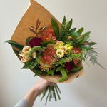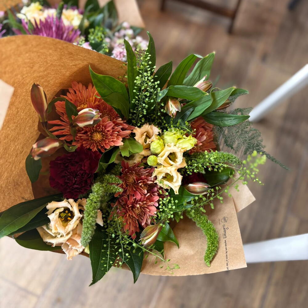 Alstroemeria - 2 ud. verdes variados - 5 ud. lisianthus crema - 3 ud. clavel burdeos - 1 ud. crisantemo terracota - 3 ud. amaranthus verde - 1 ud.