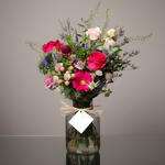 Este hermoso ramo destaca por su estilo silvestre y lleno de color, ideal para iluminar cualquier espacio. Las rosas en tonos fucsia y rosa se combinan armoniosamente con flores campestres en lavanda, blanco y magenta. Cada detalle, desde las delicadas bayas decorativas hasta las hojas verdes, aporta frescura y textura al arreglo. El jarrón transparente con un lazo natural añade un toque rústico y elegante. La mezcla de formas y colores crea una composición vibrante y llena de vida. Es perfecto para regalar en ocasiones especiales o simplemente para alegrar el día de alguien querido. ¡Un arreglo que transmite belleza, frescura y encanto natural en cada flor!