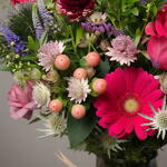 eucalipto - 4 ud. Gerbera fucsia - 1 ud. verdes varios - 3 ud. limonium malva - 4 ud. rosas fucsia - 3 ud. eryngium azul - 3 ud. verónica morada - 4 ud. hypericum rosa - 5 ud. scabiosa burdeos - 1 ud. rosas rosa pálido - 3 ud. astrantia crema - 3 ud.