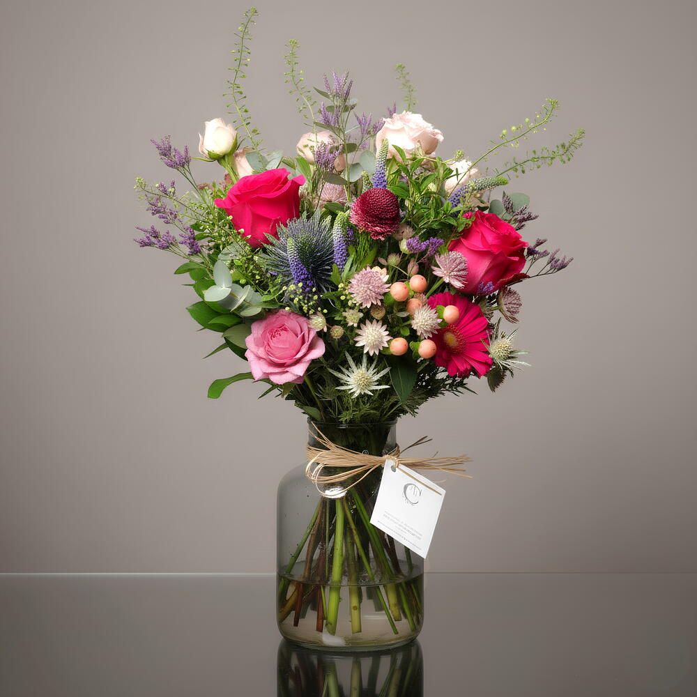 Este hermoso ramo destaca por su estilo silvestre y lleno de color, ideal para iluminar cualquier espacio. Las rosas en tonos fucsia y rosa se combinan armoniosamente con flores campestres en lavanda, blanco y magenta. Cada detalle, desde las delicadas bayas decorativas hasta las hojas verdes, aporta frescura y textura al arreglo. El jarrón transparente con un lazo natural añade un toque rústico y elegante. La mezcla de formas y colores crea una composición vibrante y llena de vida. Es perfecto para regalar en ocasiones especiales o simplemente para alegrar el día de alguien querido. ¡Un arreglo que transmite belleza, frescura y encanto natural en cada flor!