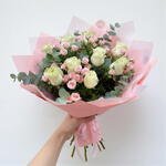 Este elegante arreglo floral de la categoría De autor se compone de 9 hermosas rosas blancas, combinadas con una abundancia de 12 rosas spray de un delicado tono rosado. También cuenta con 8 tallos de refrescante eucalipto y 5 variadas hojas verdes, cuidadosamente seleccionadas para acentuar la belleza natural de este arreglo. Cada detalle se pone junto con maestría, creando una pieza única e inolvidable.