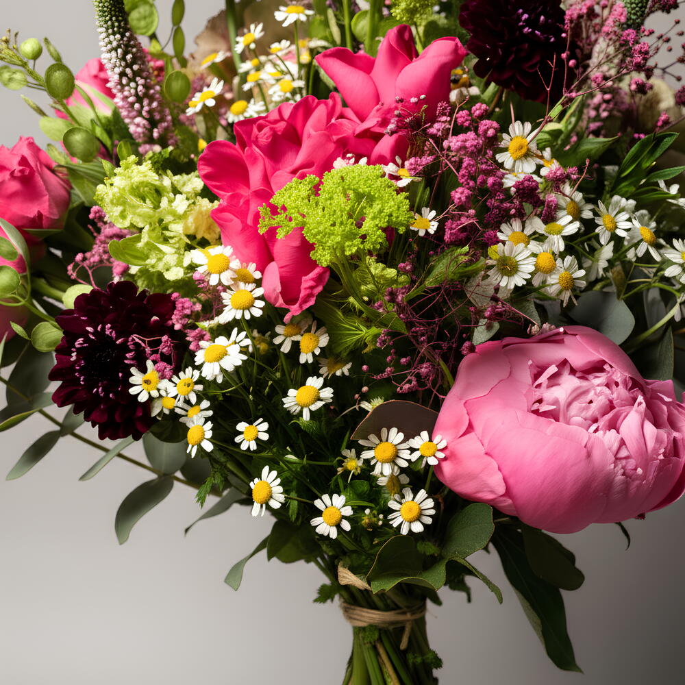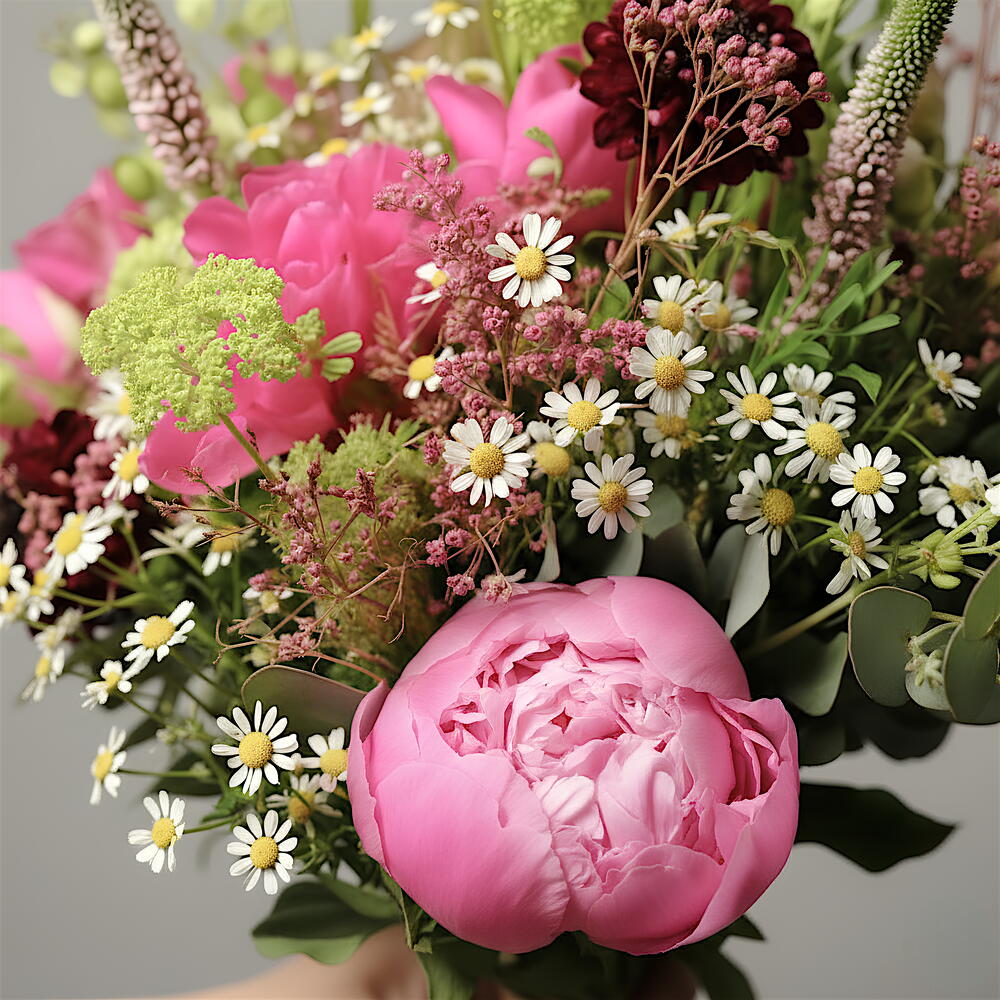 Este hermoso ramo silvestre destaca por su explosión de colores y su estilo natural lleno de encanto. Las flores en tonos fucsia, rosa y burdeos se combinan armoniosamente con toques verdes vibrantes que iluminan la composición. Las pequeñas margaritas blancas añaden un aire fresco y campestre que equilibra el diseño. La peonía rosada, grande y llamativa, se convierte en el punto focal del arreglo. El follaje variado aporta textura y movimiento, creando un ramo lleno de vida. Cada elemento ha sido cuidadosamente seleccionado para lograr una mezcla perfecta entre delicadeza y espontaneidad. ¡Un regalo ideal para alegrar cualquier ocasión con su belleza natural!