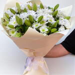Este encantador arreglo floral De autor se compone de 6 hermosos Liliums blancos, conocidos por su elegancia y sofisticación. Este bouquet se eleva aún más a nuevas alturas con la adición de 18 Crisantemos blancos - un homenaje a la belleza pura y tranquila. El diseño del bouquet se acentúa aún más con 3 piezas de vegetación decorativa, añadiendo un toque de frescura natural. Un regalo perfecto para expresar tus más profundos sentimientos.