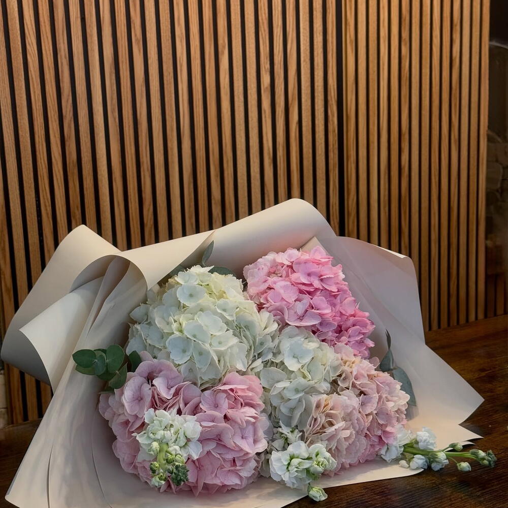 eucalipto - 2 ud. hortensia rosa - 2 ud. matthiola blanca - 2 ud. hortensia blancacrema - 2 ud. hortensia rosa suave - 1 ud.