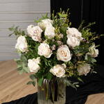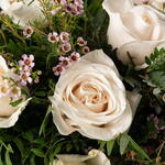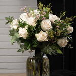 rosas blancas premium - 14 ud. flor de relleno ( Wax flower paniculata similar ) - 1 ud. eucalipto verde decorativo variado - 1 ud. base floral interior - 1 ud.