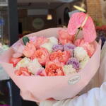 Este producto excepcional de la categoría De autor consta de un majestuoso anturio acompañado por 25 exquisitas rosas multicolores premium. La armoniosa mezcla de estos elementos crea una pieza artística única, transmitiendo una sensación de elegancia y sutileza. Ideal para imprimir un toque de sofisticación y color en cualquier ambiente.