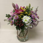 Este precioso ramo de la categoría De Autor se compone de una impresionante mezcla de flores: dos lilium rosas que aportan un suave toque de romanticismo, cuatro crisantemos lilas y dos crisantemos blancos que reflejan elegancia y pureza, dos solidago y dos wax flower rosa que dan un toque fresco y alegre. A esto se suman tres hypericum rojo que aportan un vibrante contraste de color y tres eucaliptus que añaden un toque de verde natural. Una combinación perfecta para cualquier ocasión y para transmitir cualquier sentimiento.