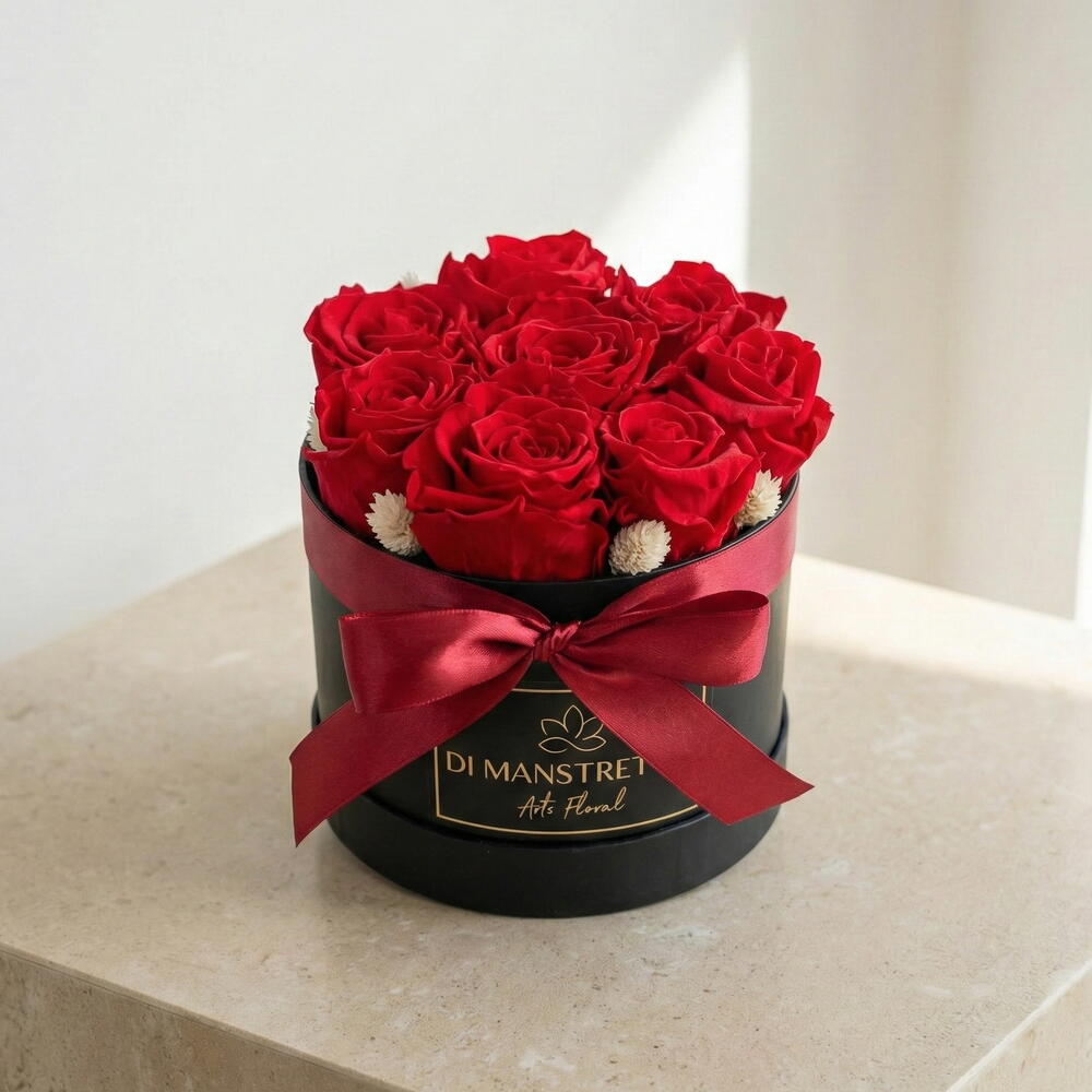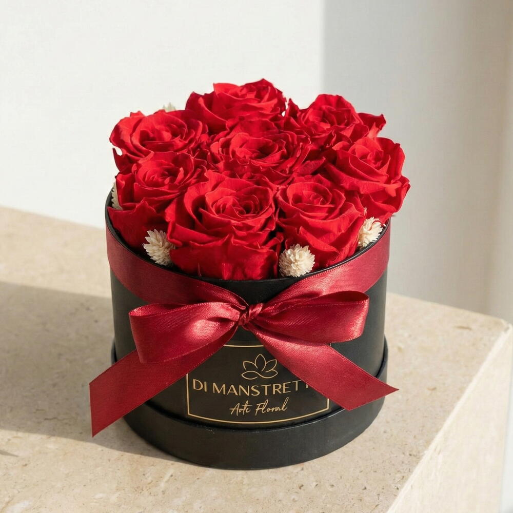 Ocho rosas rojas preservadas emergen del contraste profundo del negro, creando una pieza de impacto, elegancia y deseo. Ideal para declaraciones de amor que no se olvidan, regalos que perduran y emociones que arden en silencio.
