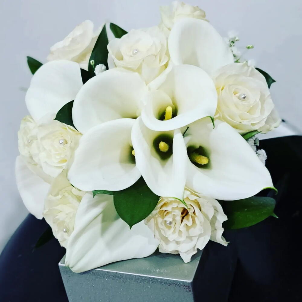 Ruscus - 3 ud. rosas blancas - 10 ud. kalas blancas - 8 ud. cinta blanca de tela - 1 ud.