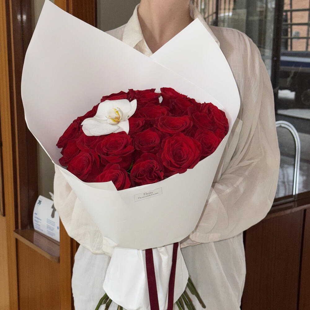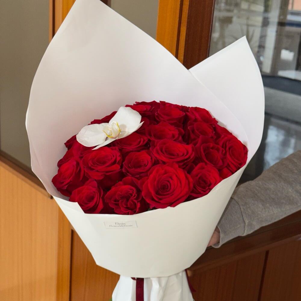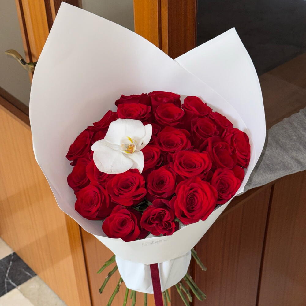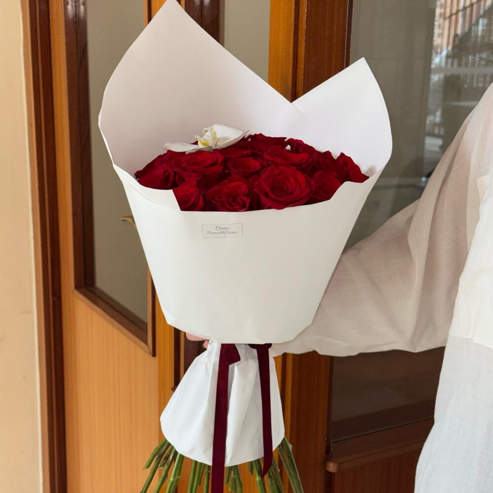 Una combinación suave y elegante de rosas rojas y una orquídea de blanco puro. El ramo está arreglado al estilo coreano, utilizando materiales premium. Cada ramo en Elysia Flowers está hecho con amor y cuidado. Además de sus flores, añadimos alimento para flores e instrucciones de cuidado.