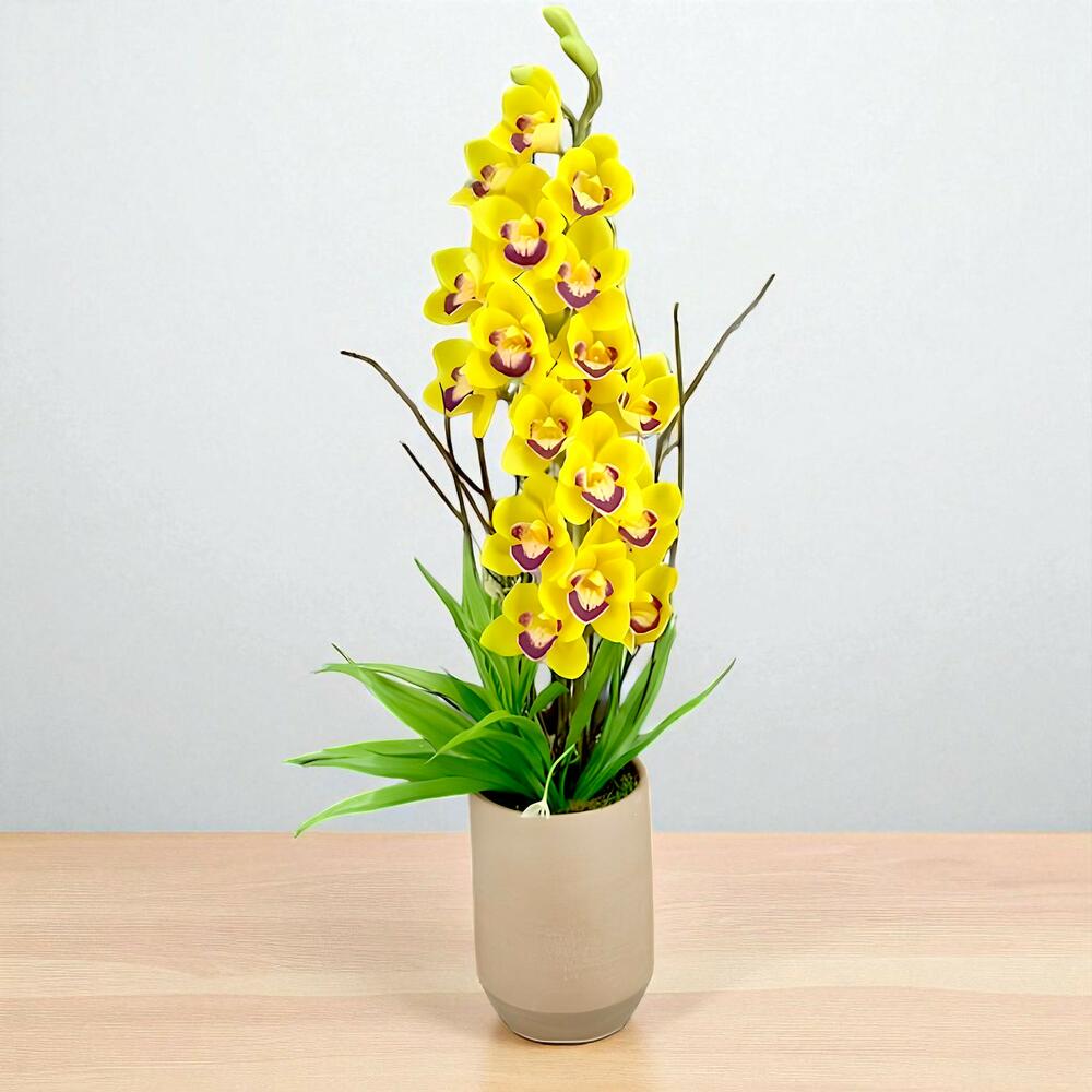 Orquídea Cymbidium Amarilla artificial sobre una base de cerámica color crema. Medidas : 90cm de altura x 26cm anchura