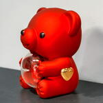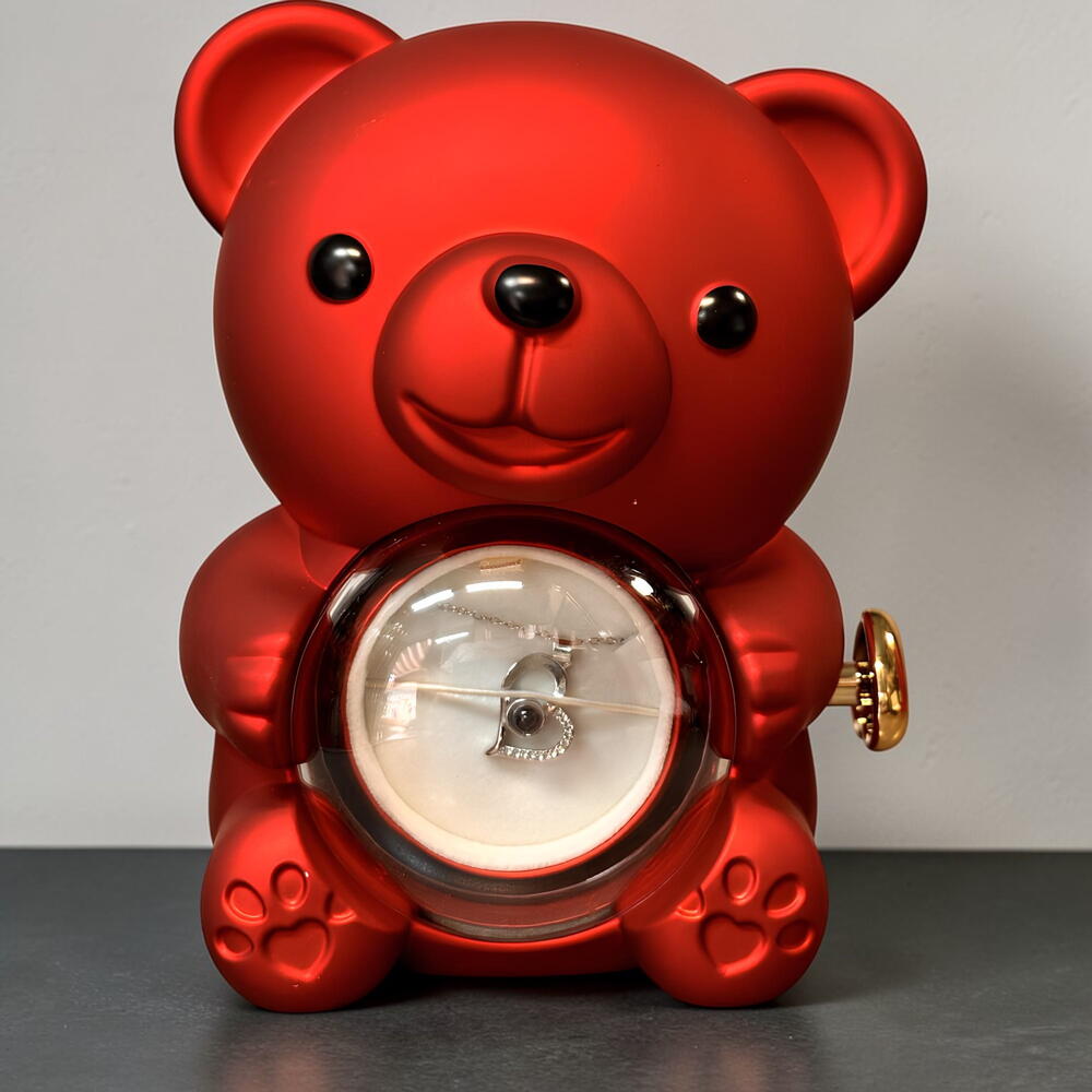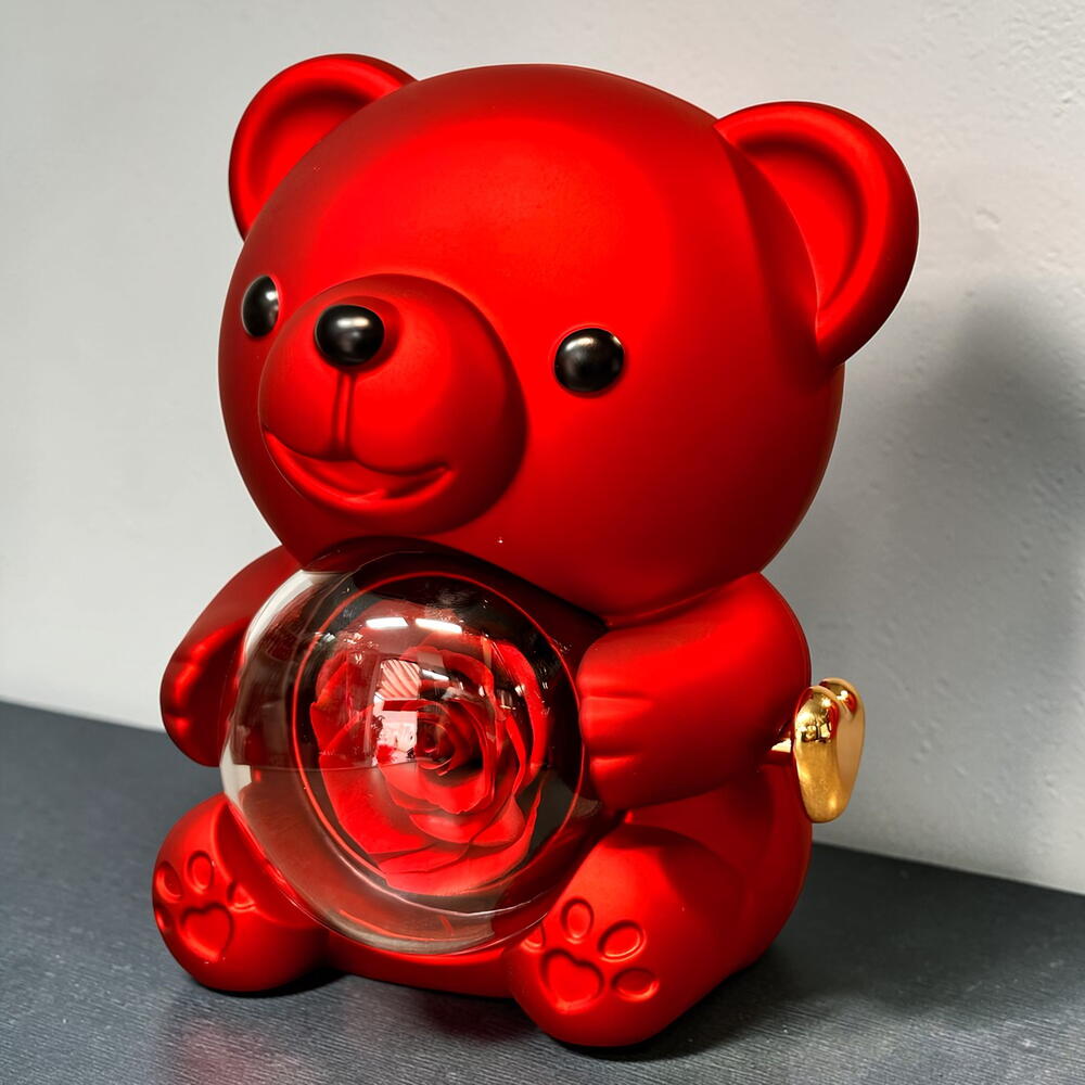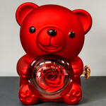 El oso de color rojo de plástico. En su barriga hay una caja con una rosa preservada en un lado y un colgante en forma de corazón en el otro. Se puede girar el mango del corazón a un lado.