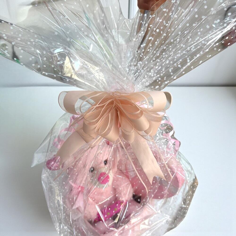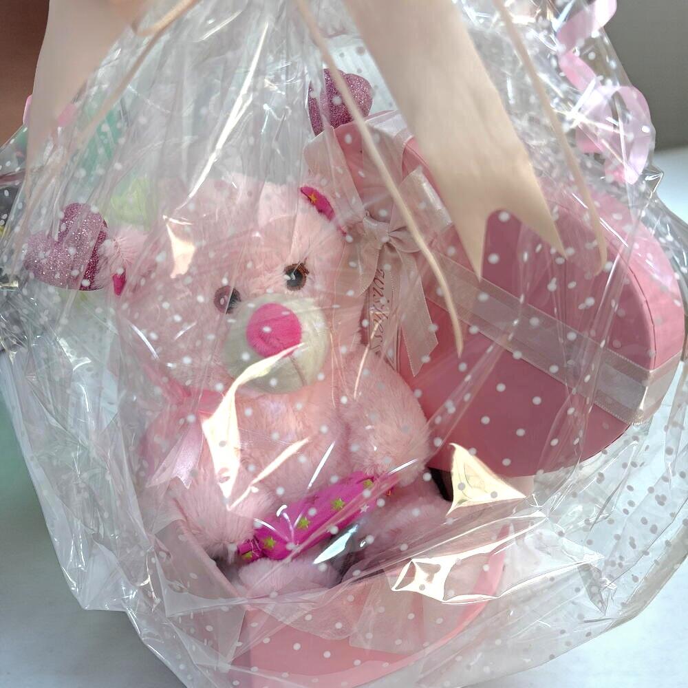 Oso con almohadita en caja con forma de corazón color rosada, dos corazones con purpurina rosada y postal de felicitación, regalo envuelto en celofán con lazo