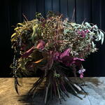Este ramo seco es una mezcla preciosa de tonos rosados, dorados y verdes: parece un pequeño bosque otoñal enredado, con hojas crujidas, flores marchitas con encanto y ramas que se abren como un abanico rústico. Tiene una vibra artística, salvaje y elegante a la vez.